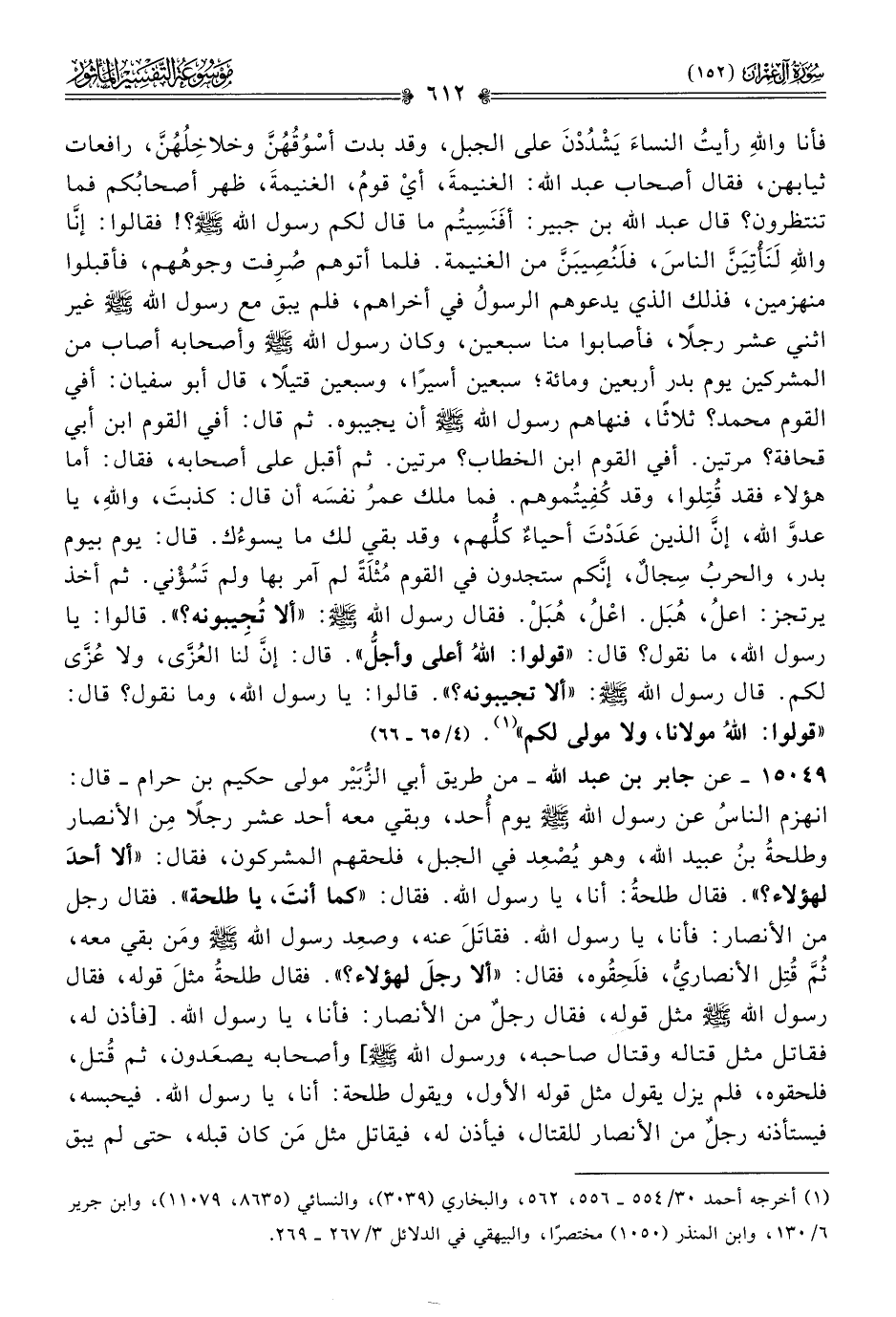 فأنا واللهِ رأيتُ النساءَ يَشْدُدْنَ على الجبل، وقد بدت أسْوُقُهُنَّ وخلاخِلُهُنَّ، رافعات ثيابهن، فقال أصحاب عبد الله: الغنيمةَ، أيْ قومُ، الغنيمةَ، ظهر أصحابُكم فما تنتظرون؟ قال عبد الله بن جبير: أفَنَسِيتُم ما قال لكم رسول الله - صلى الله عليه وسلم -؟! فقالوا: إنّا واللهِ لَنَأْتِيَنَّ الناسَ، فلَنُصِيبَنَّ من الغنيمة. فلما أتوهم صُرِفت وجوهُهم، فأقبلوا منهزمين، فذلك الذي يدعوهم الرسولُ في أخراهم، فلم يبق مع رسول الله - صلى الله عليه وسلم - غير اثني عشر رجلًا، فأصابوا منا سبعين، وكان رسول الله - صلى الله عليه وسلم - وأصحابه أصاب من المشركين يوم بدر أربعين ومائة؛ سبعين أسيرًا، وسبعين قتيلًا، قال أبو سفيان: أفي القوم محمد؟ ثلاثًا، فنهاهم رسول الله - صلى الله عليه وسلم - أن يجيبوه. ثم قال: أفي القوم ابن أبي قحافة؟ مرتين. أفي القوم ابن الخطاب؟ مرتين. ثم أقبل على أصحابه، فقال: أما هؤلاء فقد قُتِلوا، وقد كُفِيتُموهم. فما ملك عمرُ نفسَه أن قال: كذبتَ، واللهِ، يا عدوَّ الله، إنّ الذين عَدَدْتَ أحياءٌ كلُّهم، وقد بقي لك ما يسوءُك. قال: يوم بيوم بدر، والحربُ سِجالٌ، إنّكم ستجدون في القوم مُثْلَةً لم آمر بها ولم تَسُؤْني. ثم أخذ يرتجز: اعلُ، هُبَل. اعْلُ، هُبَلْ. فقال رسول الله - صلى الله عليه وسلم -: «ألا تُجِيبونه؟». قالوا: يا رسول الله، ما نقول؟ قال: «قولوا: اللهُ أعلى وأجلُّ». قال: إنّ لنا العُزّى، ولا عُزّى لكم. قال رسول الله - صلى الله عليه وسلم -: «ألا تجيبونه؟». قالوا: يا رسول الله، وما نقول؟ قال: «قولوا: اللهُ مولانا، ولا مولى لكم» (¬١).