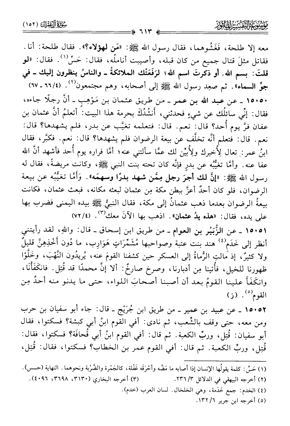 ١٥٠٥٠ - عن عبد الله بن عمر -من طريق عثمان بن مَوْهِبٍ- أنّ رجلًا جاءه، فقال: إنِّي سائلُك عن شيءٍ فحدثني، أنشُدُكَ بحرمة هذا البيت: أتعلمُ أنّ عثمان بن عفان فرَّ يوم أحد؟ قال: نعم. قال: فتعلمه تغيَّب عن بدر، فلم يشهدها؟ قال: نعم. قال: فتعلم أنّه تخلَّف عن بيعة الرضوان فلم يشهدها؟ قال: نعم. فكبَّر، فقال ابنُ عمر: تعال لِأُخبرك ولِأُبيِّن لك عمّا سألتني عنه؛ أمّا فراره يوم أحد فأشهد أنّ الله عفا عنه. وأمّا تغيُّبُه عن بدرٍ فإنّه كان تحته بنت النبي - صلى الله عليه وسلم -، وكانت مريضةً، فقال له رسول الله - صلى الله عليه وسلم -: «إنّ لك أجرَ رجل مِمَّن شهد بدرًا وسهمَه». وأَمّا تغيُّبُه عن بيعة الرضوان، فلو كان أحدٌ أعزَّ ببطن مكة مِن عثمان لبعثه مكانه، فبعث عثمان، فكانت بيعةُ الرضوان بعدما ذهب عثمانُ إلى مكة، فقال النبيُّ - صلى الله عليه وسلم - بيده اليمنى فضرب بها على يده، فقال: «هذه يدُ عثمان». اذهب بها الآنَ معك (¬٣). (٤/ ٧٢)
