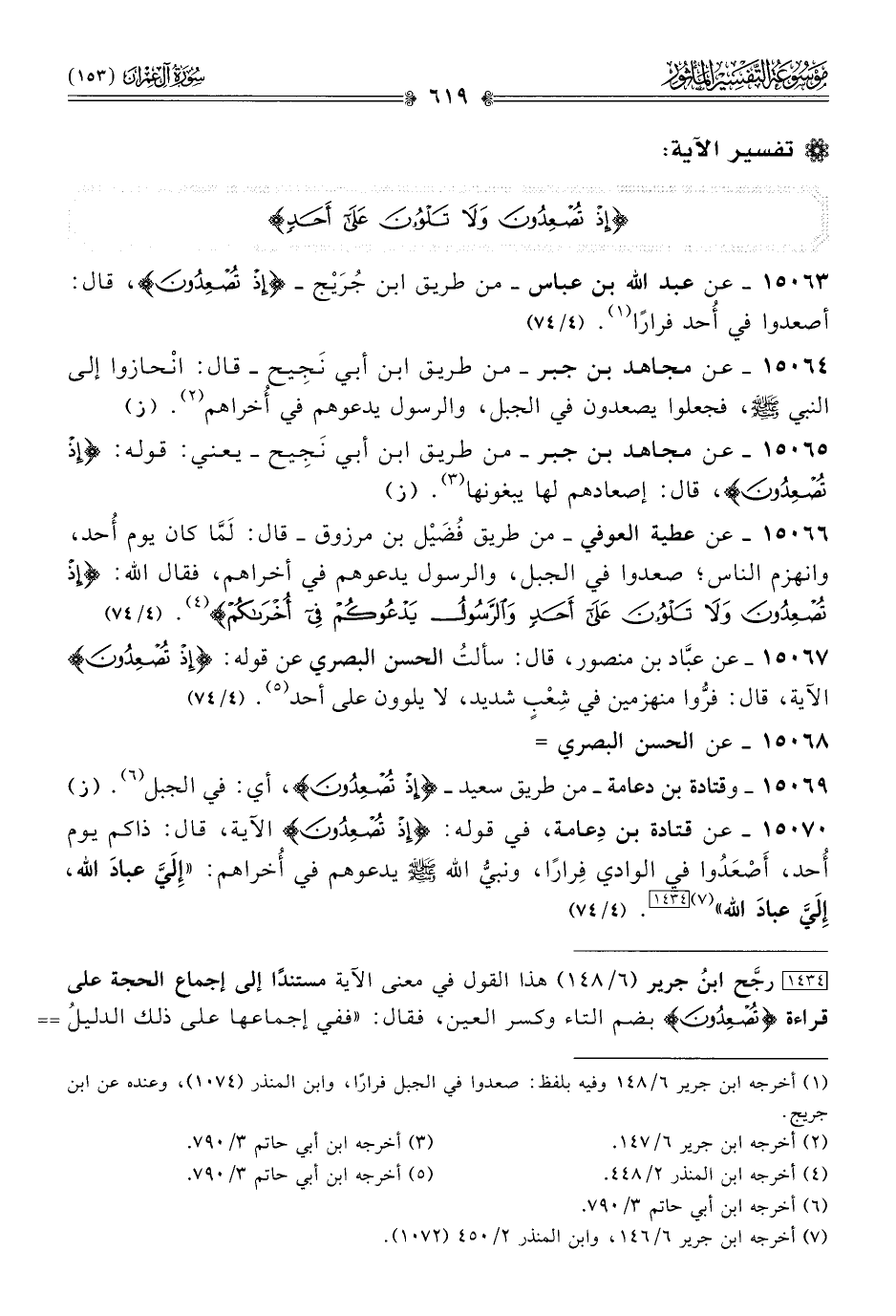[١٤٣٤] رجَّح ابنُ جرير (٦/ ١٤٨) هذا القول في معنى الآية مستندًا إلى إجماع الحجة على قراءة {تصعدون} بضم التاء وكسر العين، فقال: «ففي إجماعها على ذلك الدليلُ الواضحُ على أنّ أولى التأويلين بالآية تأويلُ من قال: أصعدوا في الوادي ومضوا فيه. دون قول من قال: صعدوا على الجبل».