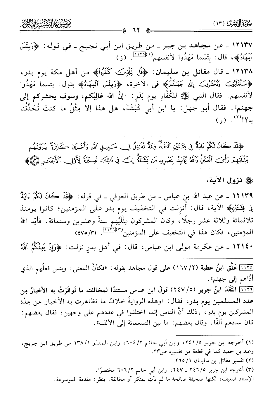 ١٢١٣٩ - عن عبد الله بن عباس -من طريق العوفي- في قوله: {قد كان لكم آية في فئتين} الآية، قال: أُنزِلت في التخفيف يوم بدر على المؤمنين؛ كانوا يومئذ ثلاثمائة وثلاثة عشر رجلًا، وكان المشركون مِثْلَيْهم ستةً وعشرين وستمائة، فأيّد اللهُ المؤمنين، فكان هذا في التخفيف على المؤمنين (¬٣) [١١٢٦]. (٣/ ٤٧٥)