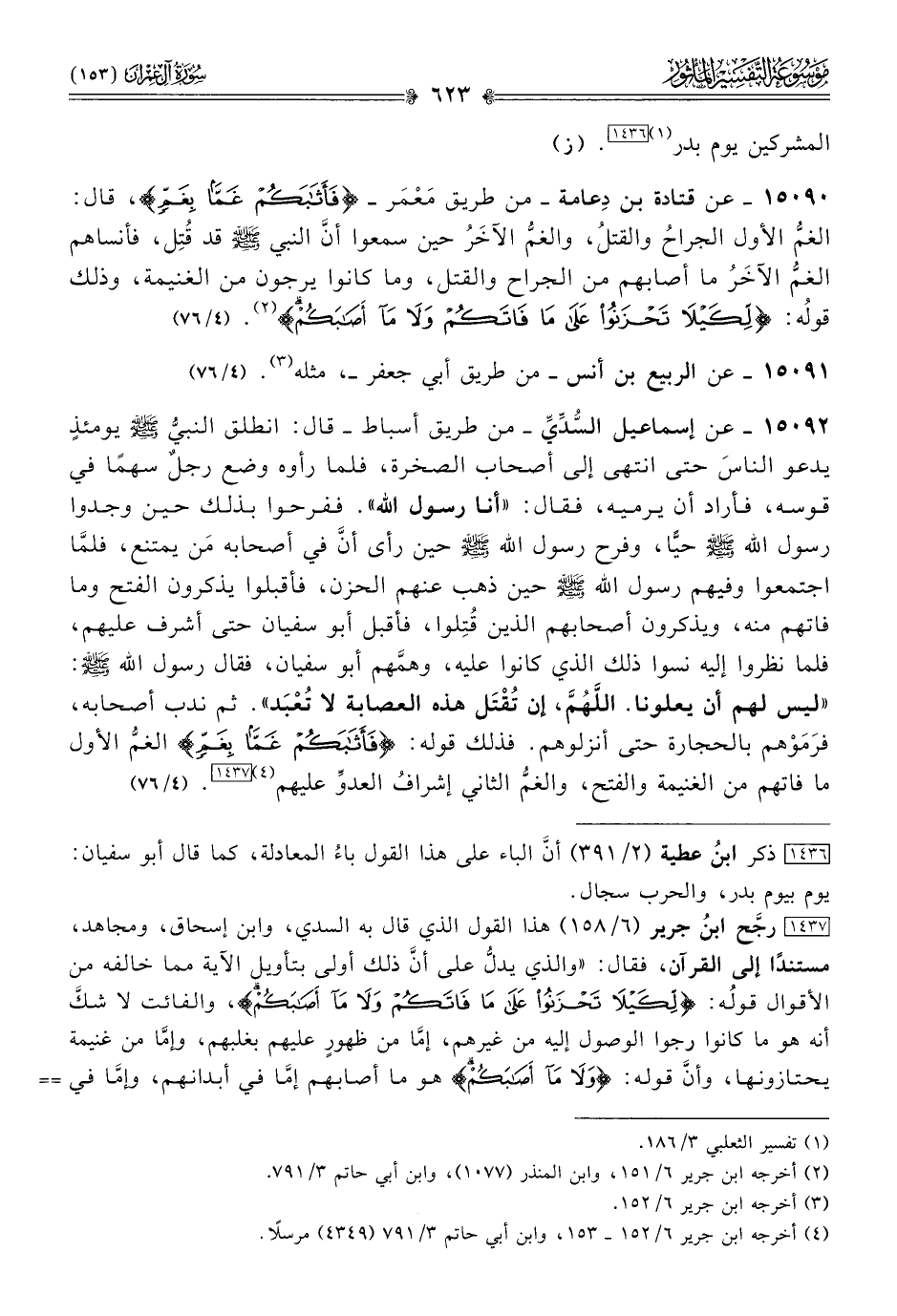 ١٥٠٩٠ - عن قتادة بن دِعامة -من طريق مَعْمَر- {فأثابكم غما بغم}، قال: الغمُّ الأول الجراحُ والقتلُ، والغمُّ الآخَرُ حين سمعوا أنّ النبي - صلى الله عليه وسلم - قد قُتِل، فأنساهم الغمُّ الآخَرُ ما أصابهم من الجراح والقتل، وما كانوا يرجون من الغنيمة، وذلك قولُه: {لكيلا تحزنوا على ما فاتكم ولا ما أصابكم} (¬٢). (٤/ ٧٦)