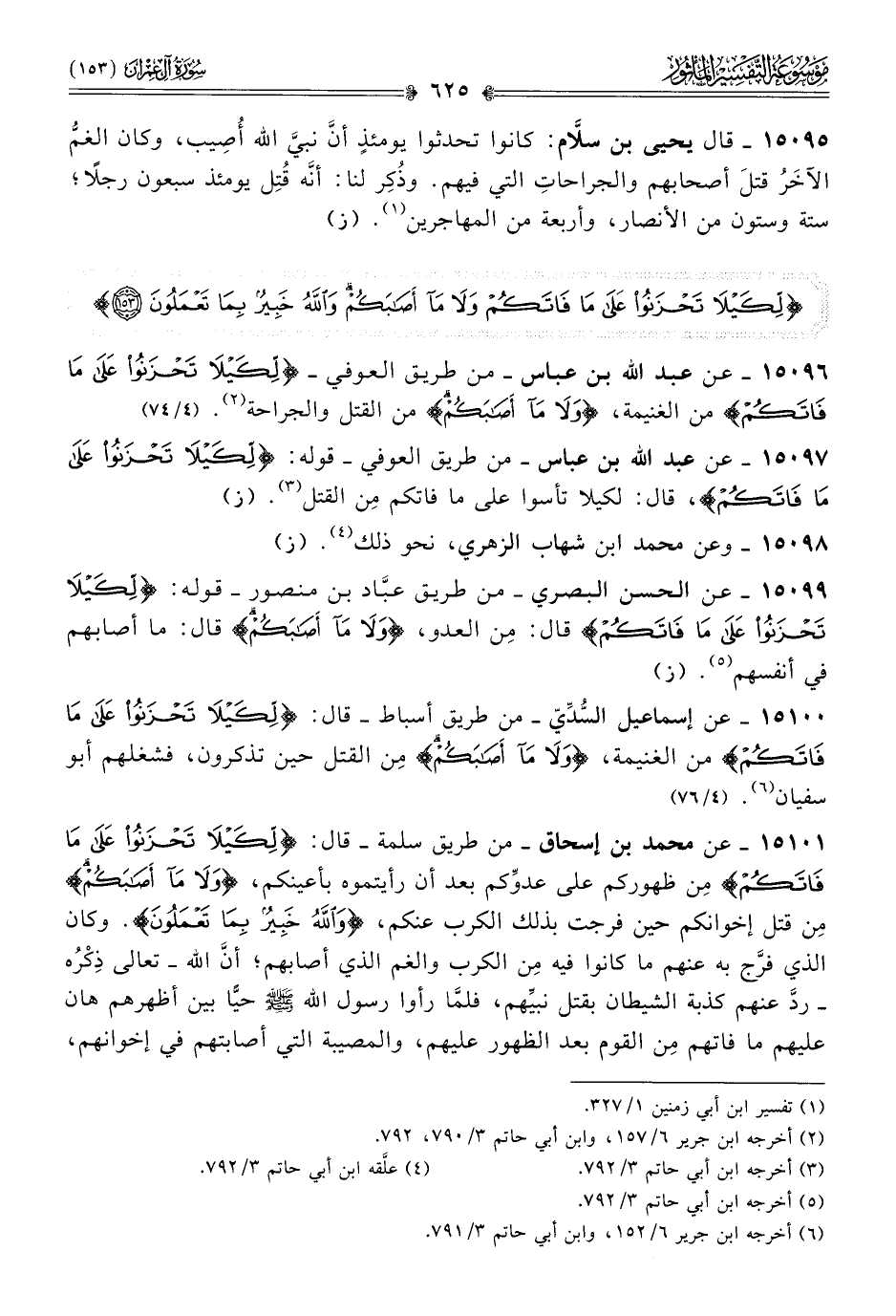 ١٥٠٩٦ - عن عبد الله بن عباس -من طريق العوفي- {لكيلا تحزنوا على ما فاتكم} من الغنيمة، {ولا ما أصابكم} من القتل والجراحة (¬٢). (٤/ ٧٤)