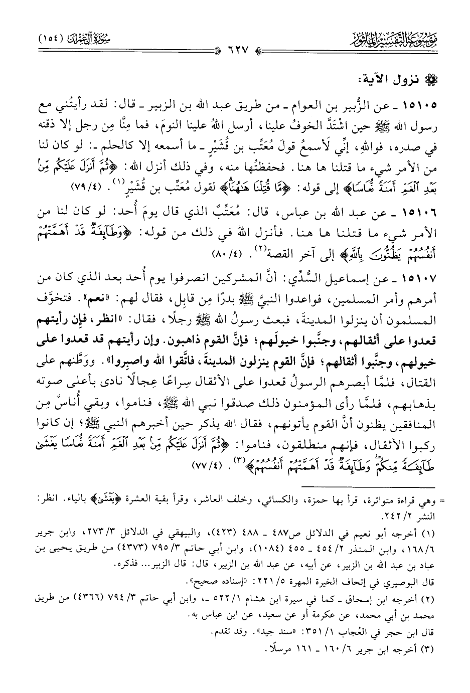 ١٥١٠٥ - عن الزُّبير بن العوام -من طريق عبد الله بن الزبير- قال: لقد رأيتُني مع رسول الله - صلى الله عليه وسلم - حين اشْتَدَّ الخوفُ علينا، أرسل اللهُ علينا النومَ، فما مِنّا مِن رجل إلا ذقنه في صدره، فواللهِ، إنِّي لَأسمعُ قولَ مُعَتِّب بن قُشَيْرٍ -ما أسمعه إلا كالحلم-: لو كان لنا من الأمر شيء ما قتلنا ها هنا. فحفظتُها منه، وفي ذلك أنزل الله: {ثم أنزل عليكم من بعد الغم أمنة نعاسا} إلى قوله: {ما قتلنا ها هنا} لقول مُعَتِّب بن قُشَيْرٍ (¬١). (٤/ ٧٩)