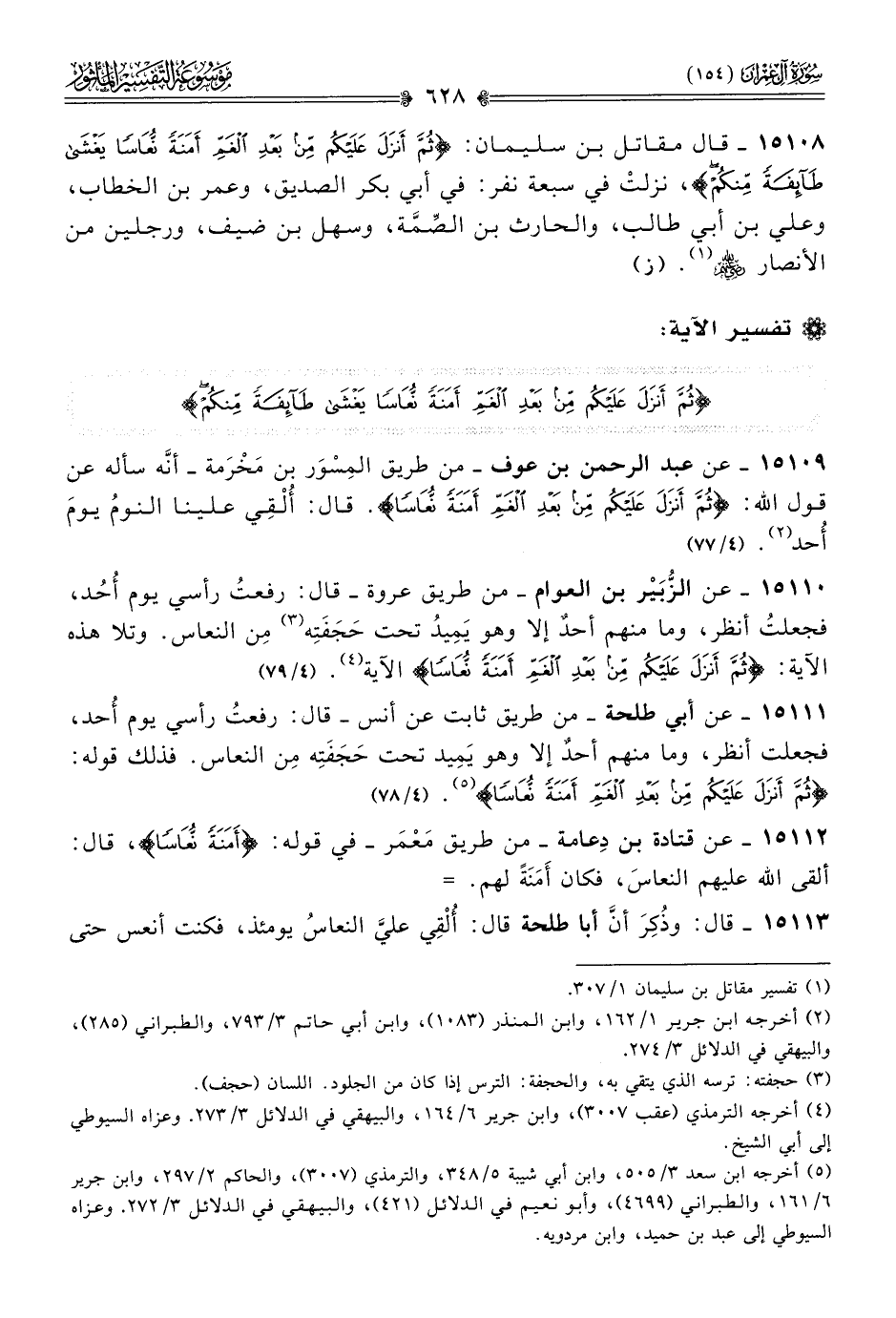 ١٥١١٠ - عن الزُّبَيْر بن العوام -من طريق عروة- قال: رفعتُ رأسي يوم أُحُد، فجعلتُ أنظر، وما منهم أحدٌ إلا وهو يَمِيدُ تحت حَجَفَتِه (¬٣) مِن النعاس. وتلا هذه الآية: {ثم أنزل عليكم من بعد الغم أمنة نعاسا} الآية (¬٤). (٤/ ٧٩)