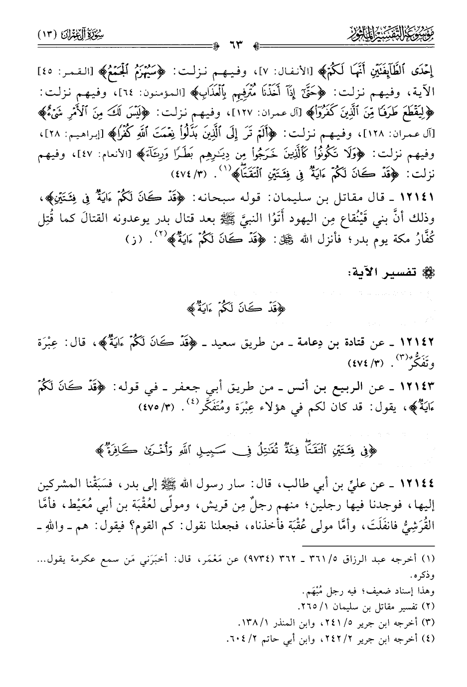 ١٢١٤٢ - عن قتادة بن دِعامة -من طريق سعيد- {قد كان لكم آية}، قال: عِبْرَة وتَفَكُّرٌ (¬٣). (٣/ ٤٧٤)