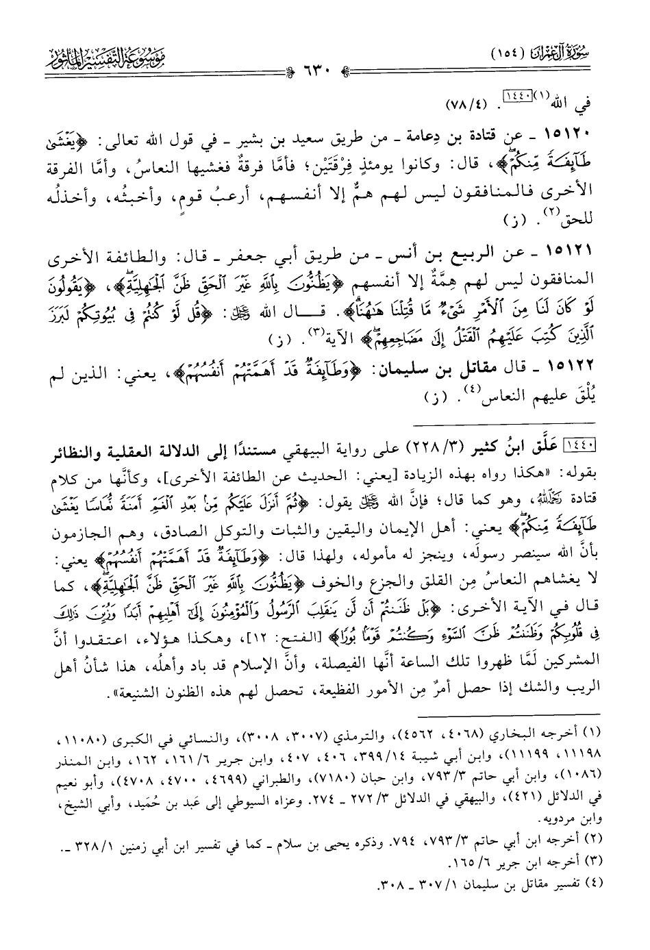 [١٤٤٠] عَلَّق ابنُ كثير (٣/ ٢٢٨) على رواية البيهقي مستندًا إلى الدلالة العقلية والنظائر بقوله: «هكذا رواه بهذه الزيادة [يعني: الحديث عن الطائفة الأخرى]، وكأنّها من كلام قتادة?، وهو كما قال؛ فإنّ الله - عز وجل - يقول: {ثم أنزل عليكم من بعد الغم أمنة نعاسا يغشى طائفة منكم} يعني: أهل الإيمان واليقين والثبات والتوكل الصادق، وهم الجازمون بأنّ الله سينصر رسولَه، وينجز له مأموله، ولهذا قال: {وطائفة قد أهمتهم أنفسهم} يعني: لا يغشاهم النعاسُ مِن القلق والجزع والخوف {يظنون بالله غير الحق ظن الجاهلية}، كما قال في الآية الأخرى: {بل ظننتم أن لن ينقلب الرسول والمؤمنون إلى أهليهم أبدا وزين ذلك في قلوبكم وظننتم ظن السوء وكنتم قوما بورا} [الفتح: ١٢]، وهكذا هؤلاء، اعتقدوا أنّ المشركين لَمّا ظهروا تلك الساعة أنّها الفيصلة، وأنّ الإسلام قد باد وأهلُه، هذا شأنُ أهل الريب والشك إذا حصل أمرٌ مِن الأمور الفظيعة، تحصل لهم هذه الظنون الشنيعة».