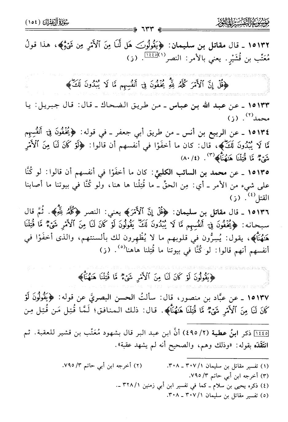 ١٥١٣٧ - عن عبّاد بن منصور، قال: سألتُ الحسن البصريَّ عن قوله: {يقولون لو كان لنا من الأمر شيء ما قتلنا هاهنا}. قال: ذلك المنافق؛ لَمّا قُتِل مَن قُتِل