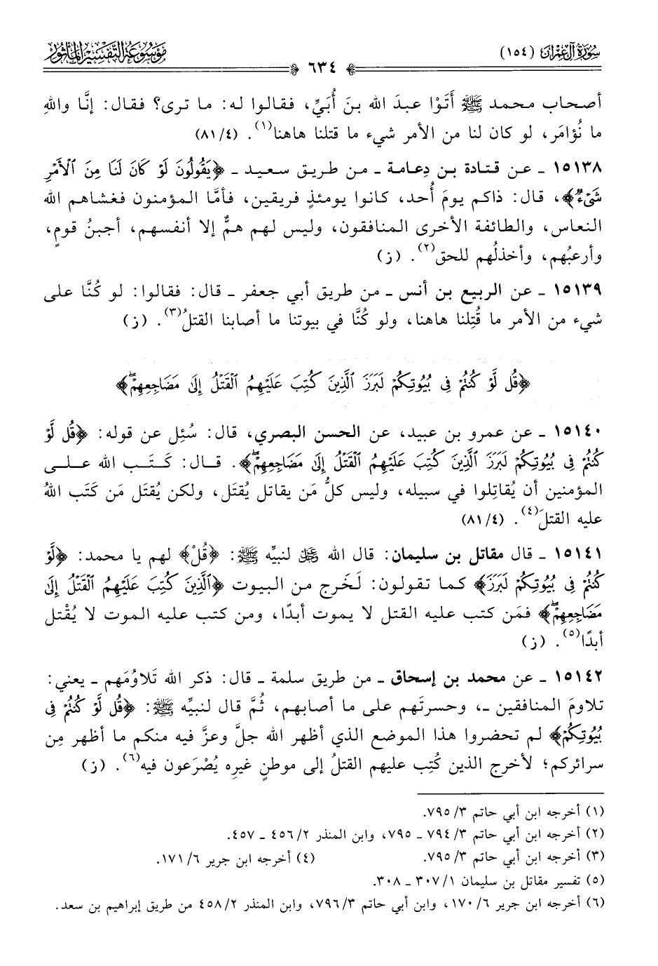 ١٥١٣٩ - عن الربيع بن أنس -من طريق أبي جعفر- قال: فقالوا: لو كُنّا على شيء من الأمر ما قُتِلنا هاهنا، ولو كُنّا في بيوتنا ما أصابنا القتلُ (¬٣). (ز)