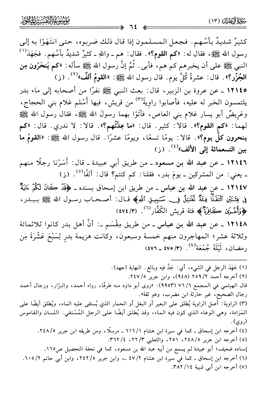 ١٢١٤٦ - عن عبد الله بن مسعود -من طريق أبي عبيدة- قال: أسَرْنا رجلًا منهم -يعني: من المشركين- يومَ بدر، فقلنا: كم كنتم؟ قال: ألفًا (¬٥). (ز)