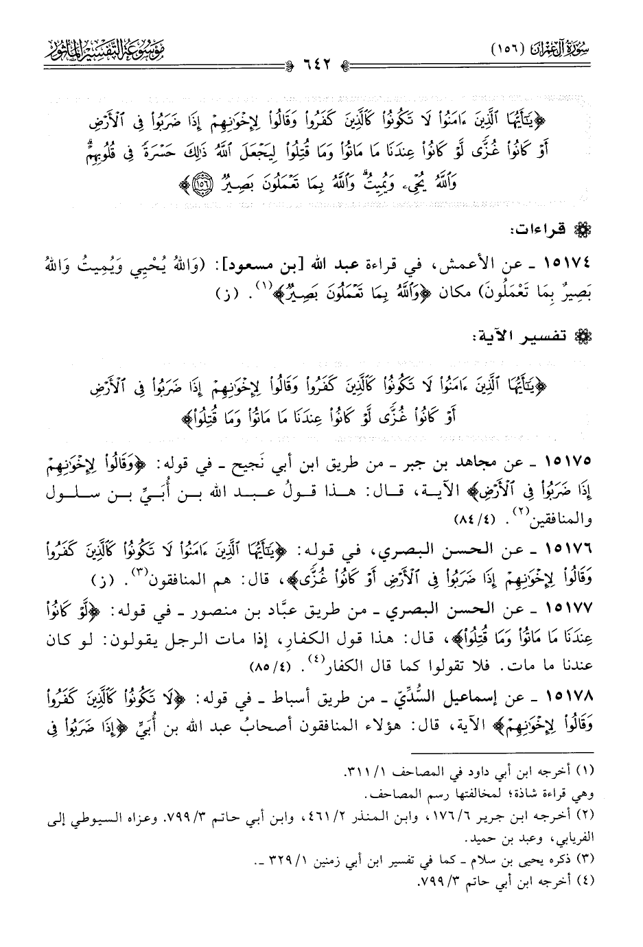 ١٥١٧٧ - عن الحسن البصري -من طريق عبّاد بن منصور- في قوله: {لو كانوا عندنا ما ماتوا وما قتلوا}، قال: هذا قول الكفارِ، إذا مات الرجل يقولون: لو كان عندنا ما مات. فلا تقولوا كما قال الكفار (¬٤). (٤/ ٨٥)