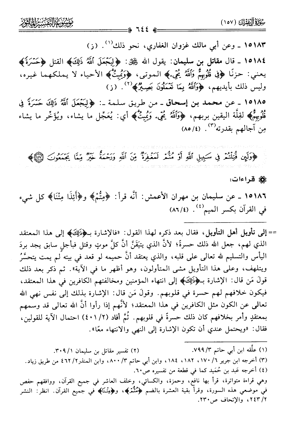 ١٥١٨٥ - عن محمد بن إسحاق -من طريق سلمة-: {ليجعل الله ذلك حسرة في قلوبهم} لقِلَّة اليقين بربهم، {والله يحيي ويميت} أي: يُعَجِّل ما يشاء، ويُؤَخِّر ما يشاء مِن آجالهم بقدرته (¬٣). (٤/ ٨٥)