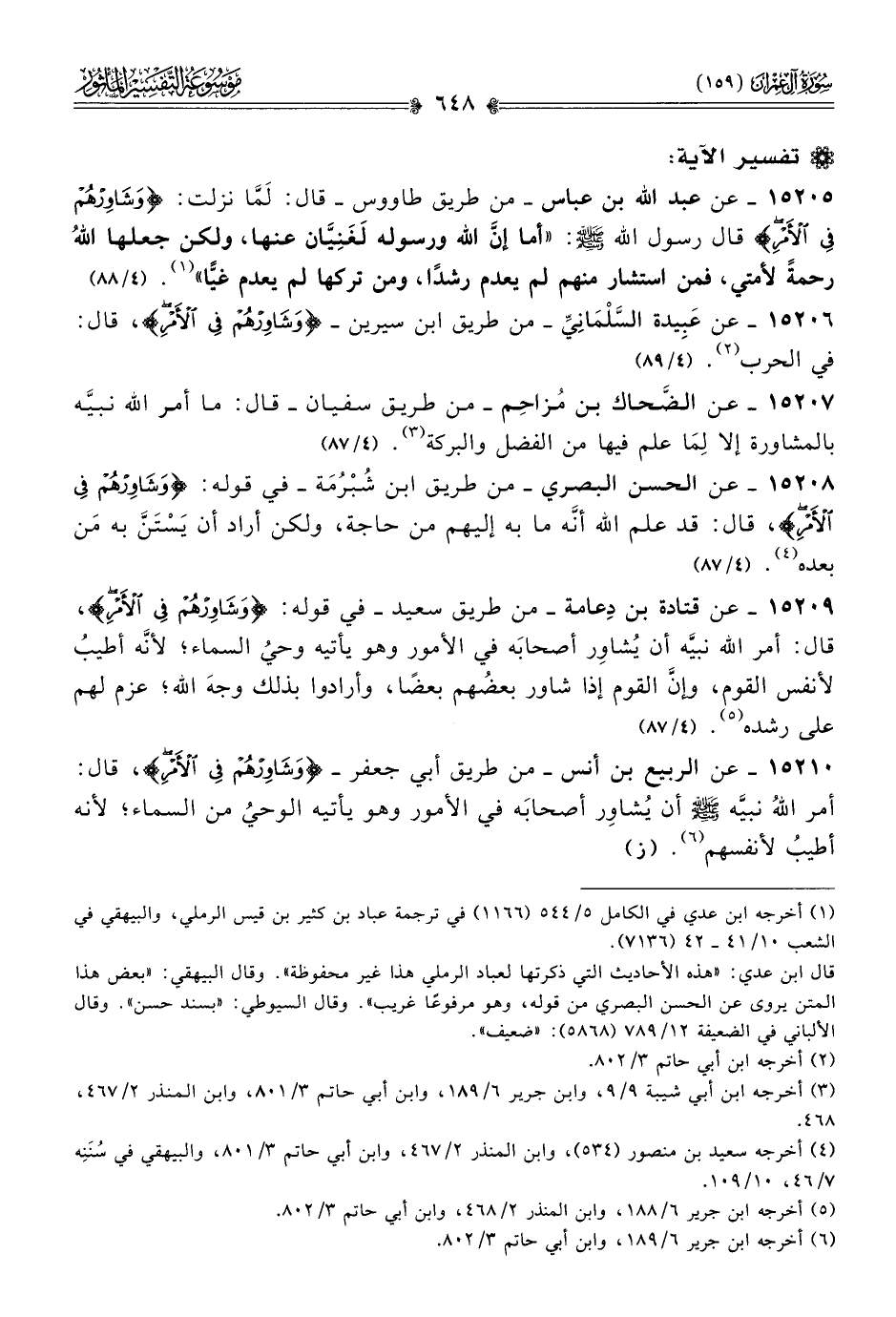 ١٥٢٠٩ - عن قتادة بن دِعامة -من طريق سعيد- في قوله: {وشاورهم في الأمر}، قال: أمر الله نبيَّه أن يُشاوِر أصحابَه في الأمور وهو يأتيه وحيُ السماء؛ لأنّه أطيبُ لأنفس القوم، وإنّ القوم إذا شاور بعضُهم بعضًا، وأرادوا بذلك وجهَ الله؛ عزم لهم على رشده (¬٥). (٤/ ٨٧)