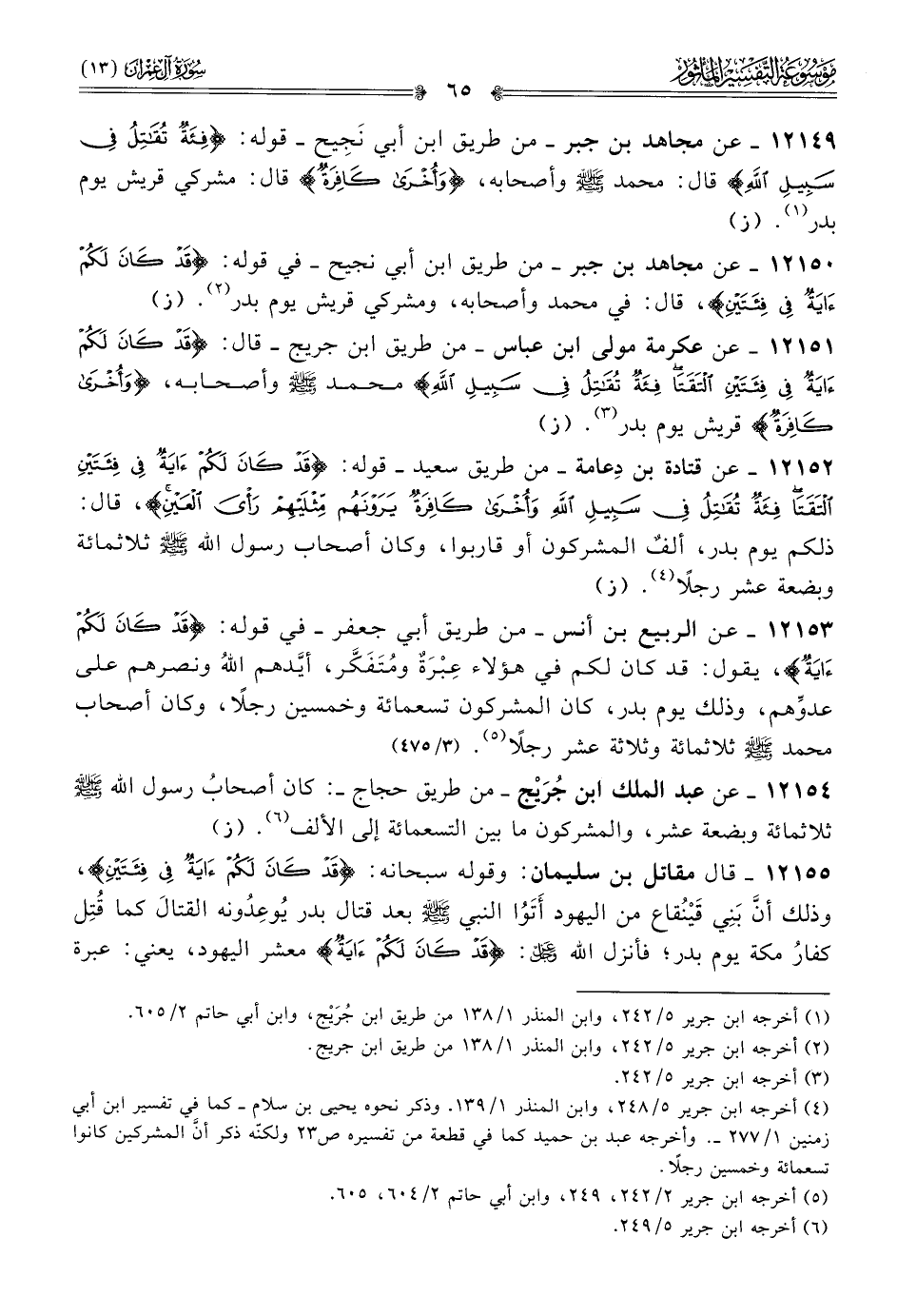 ١٢١٤٩ - عن مجاهد بن جبر -من طريق ابن أبي نَجِيح- قوله: {فئة تقاتل في سبيل الله} قال: محمد - صلى الله عليه وسلم - وأصحابه، {وأخرى كافرة} قال: مشركي قريش يوم بدر (¬١). (ز)