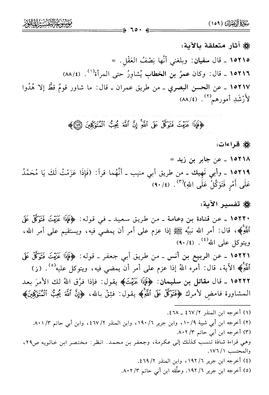 ١٥٢١٩ - وأبي نَهِيك -من طريق أبي منيب- أنّهُما قرآ: (فَإذا عَزَمْتُ لَكَ يا مُحَمَّدُ عَلى أمْرٍ فَتَوَكَّلْ عَلى اللهِ) (¬٣). (٤/ ٩٠)