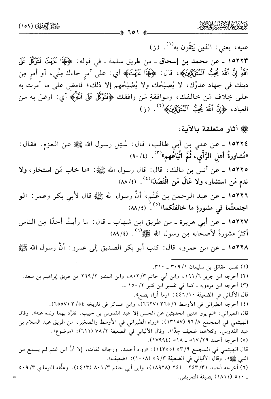 ١٥٢٢٤ - عن علي بن أبي طالب، قال: سُئِل رسول الله - صلى الله عليه وسلم - عن العزم. فقال: «مُشاورةُ أهلِ الرَّأْيِ، ثُمَّ اتِّباعُهم» (¬٣). (٤/ ٩٠)