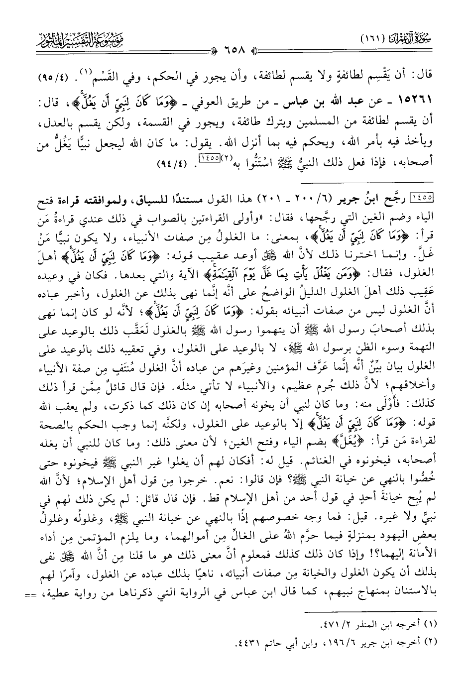 ١٥٢٦١ - عن عبد الله بن عباس -من طريق العوفي- {وما كان لنبي أن يغل}، قال: أن يقسم لطائفة من المسلمين ويترك طائفة، ويجور في القسمة، ولكن يقسم بالعدل، ويأخذ فيه بأمر الله، ويحكم فيه بما أنزل الله. يقول: ما كان الله ليجعل نبيًّا يَغُلُّ من أصحابه، فإذا فعل ذلك النبيُّ - صلى الله عليه وسلم - اسْتَنُّوا به (¬٢) [١٤٥٥]. (٤/ ٩٤)
