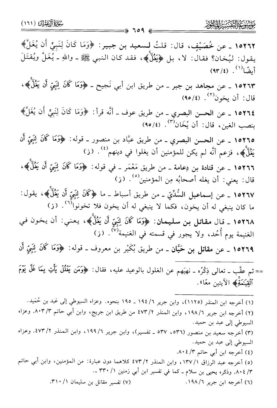 ١٥٢٦٣ - عن مجاهد بن جبر -من طريق ابن أبي نَجيح- {وما كان لنبي أن يغل}، قال: أن يخون (¬٢). (٤/ ٩٥)