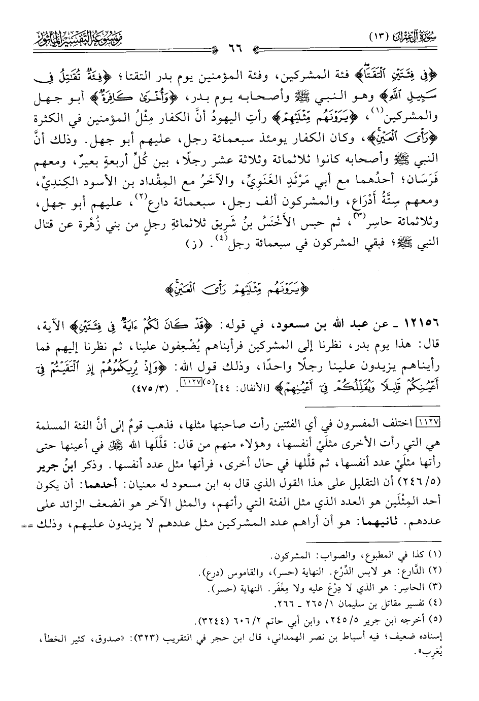 ١٢١٥٦ - عن عبد الله بن مسعود، في قوله: {قد كان لكم آية في فئتين} الآية، قال: هذا يوم بدر، نظرنا إلى المشركين فرأيناهم يُضْعِفون علينا، ثم نظرنا إليهم فما رأيناهم يزيدون علينا رجلًا واحدًا، وذلك قول الله: {وإذ يريكموهم إذ التقيتم في أعينكم قليلا ويقللكم في أعينهم} [الأنفال: ٤٤] (¬٥) [١١٢٧]. (٣/ ٤٧٥)