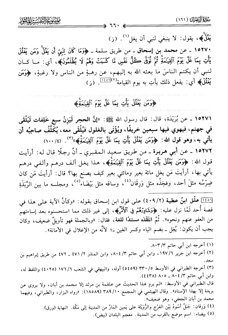 ١٥٢٧٠ - عن محمد بن إسحاق -من طريق سلمة- {وما كان لنبي أن يغل ومن يغلل يأت بما غل يوم القيامة ثم توفى كل نفس ما كسبت وهم لا يظلمون}، أي: ما كان لنبي أن يكتم الناسَ ما بعثه الله به إليهم، عن رهبةٍ من الناس ولا رغبةٍ، {ومن يغلل} أي: يفعل ذلك يأتِ به يوم القيامة (¬٢) [١٤٥٦]. (ز)