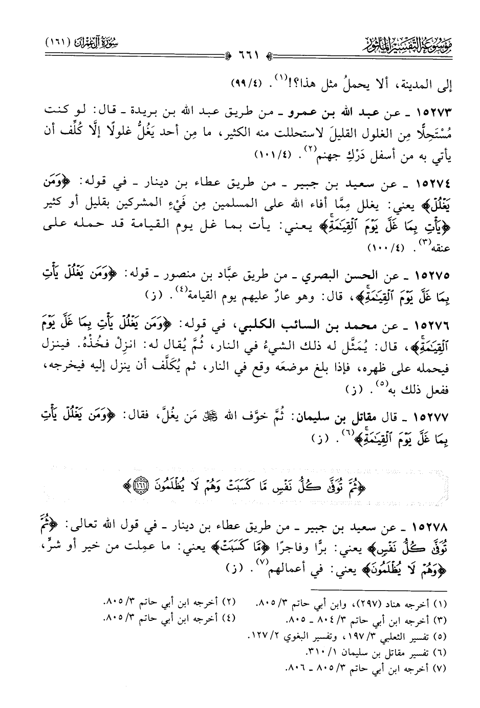 ١٥٢٧٤ - عن سعيد بن جبير -من طريق عطاء بن دينار- في قوله: {ومن يغلل} يعني: يغلل مِمّا أفاء الله على المسلمين مِن فَيْءِ المشركين بقليل أو كثير {يأت بما غل يوم القيامة} يعني: يأت بما غل يوم القيامة قد حمله على عنقه (¬٣). (٤/ ١٠٠)