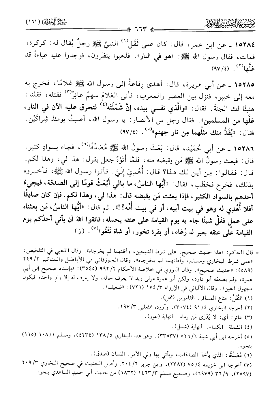 ١٥٢٨٤ - عن ابن عمر، قال: كان على ثَقَل (¬١) النبيِّ - صلى الله عليه وسلم - رجلٌ يُقال له: كركرة، فمات، فقال رسول الله - صلى الله عليه وسلم -: «هو في النار». فذهبوا ينظرون، فوجدوا عليه عباءةً قد غلَّها (¬٢). (٤/ ٩٧)