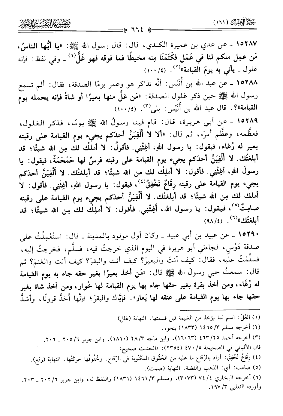 ١٥٢٨٨ - عن عبد الله بن أُنَيْس: أنّه تذاكر هو وعمر يومًا الصدقة، فقال: ألم تسمع رسول الله - صلى الله عليه وسلم - حين ذكر غلول الصدقة: «مَن غلَّ منها بعيرًا أو شاةً فإنه يحمله يوم القيامة»؟. قال عبد الله بن أُنَيْس: بلى (¬٣). (٤/ ١٠٠)