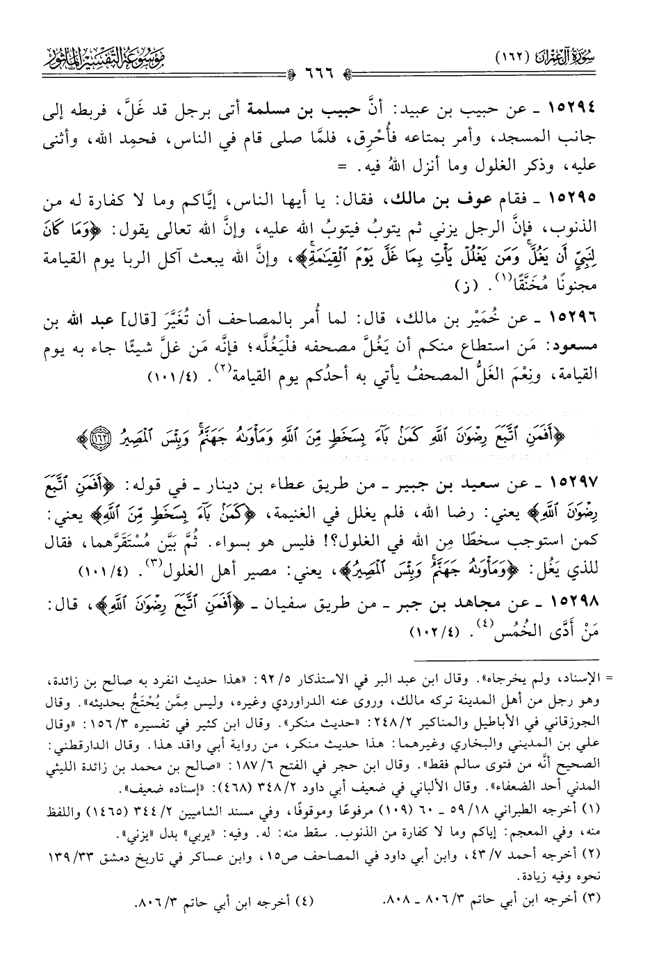 ١٥٢٩٧ - عن سعيد بن جبير -من طريق عطاء بن دينار- في قوله: {أفمن اتبع رضوان الله} يعني: رضا الله، فلم يغلل في الغنيمة، {كمن باء بسخط من الله} يعني: كمن استوجب سخطًا مِن الله في الغلول؟! فليس هو بسواء. ثُمَّ بَيَّن مُسْتَقَرَّهما، فقال للذي يَغُل: {ومأواه جهنم وبئس المصير}، يعني: مصير أهل الغلول (¬٣). (٤/ ١٠١)