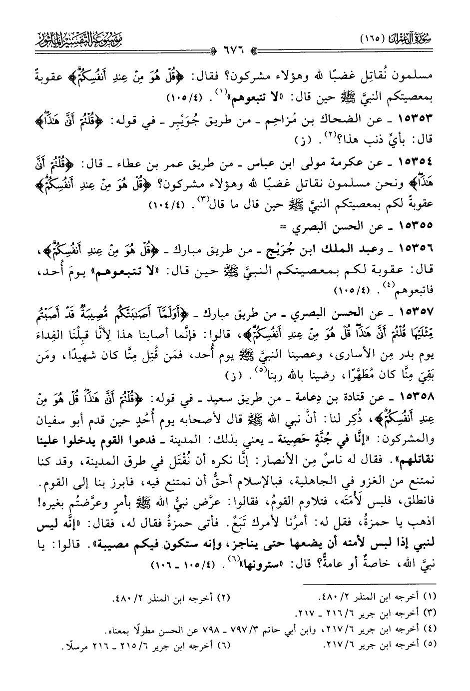 ١٥٣٥٦ - وعبد الملك ابن جُرَيْج -من طريق مبارك- {قل هو من عند أنفسكم}، قال: عقوبة لكم بمعصيتكم النبيَّ - صلى الله عليه وسلم - حين قال: «لا تتبعوهم» يومَ أحد، فاتبعوهم (¬٤). (٤/ ١٠٥)