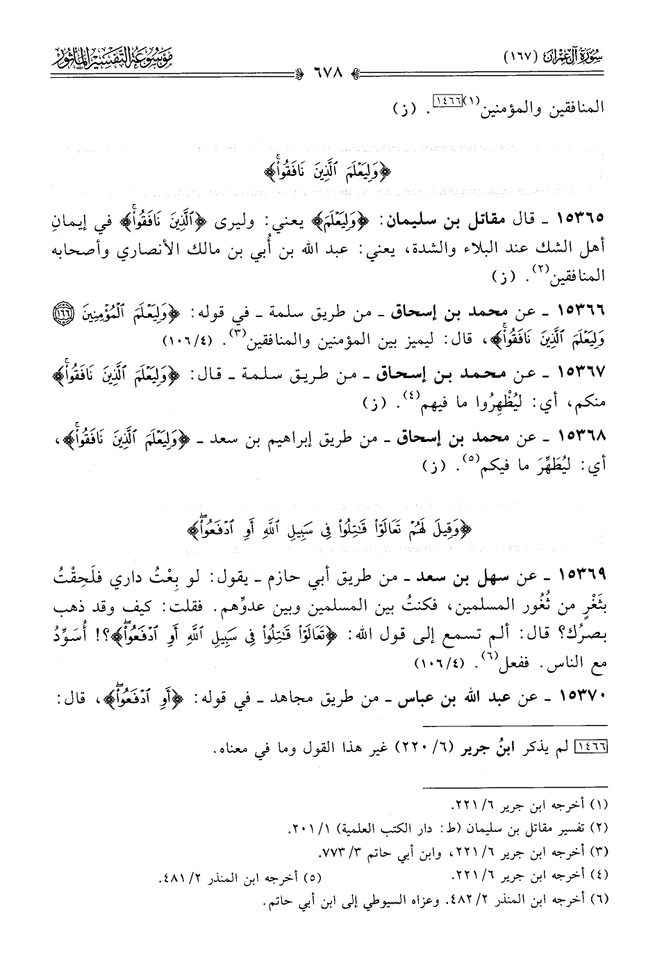 ١٥٣٦٦ - عن محمد بن إسحاق -من طريق سلمة-، في قوله: {وليعلم المؤمنين وليعلم الذين نافقوا}، قال: ليميز بين المؤمنين والمنافقين (¬٣). (٤/ ١٠٦)