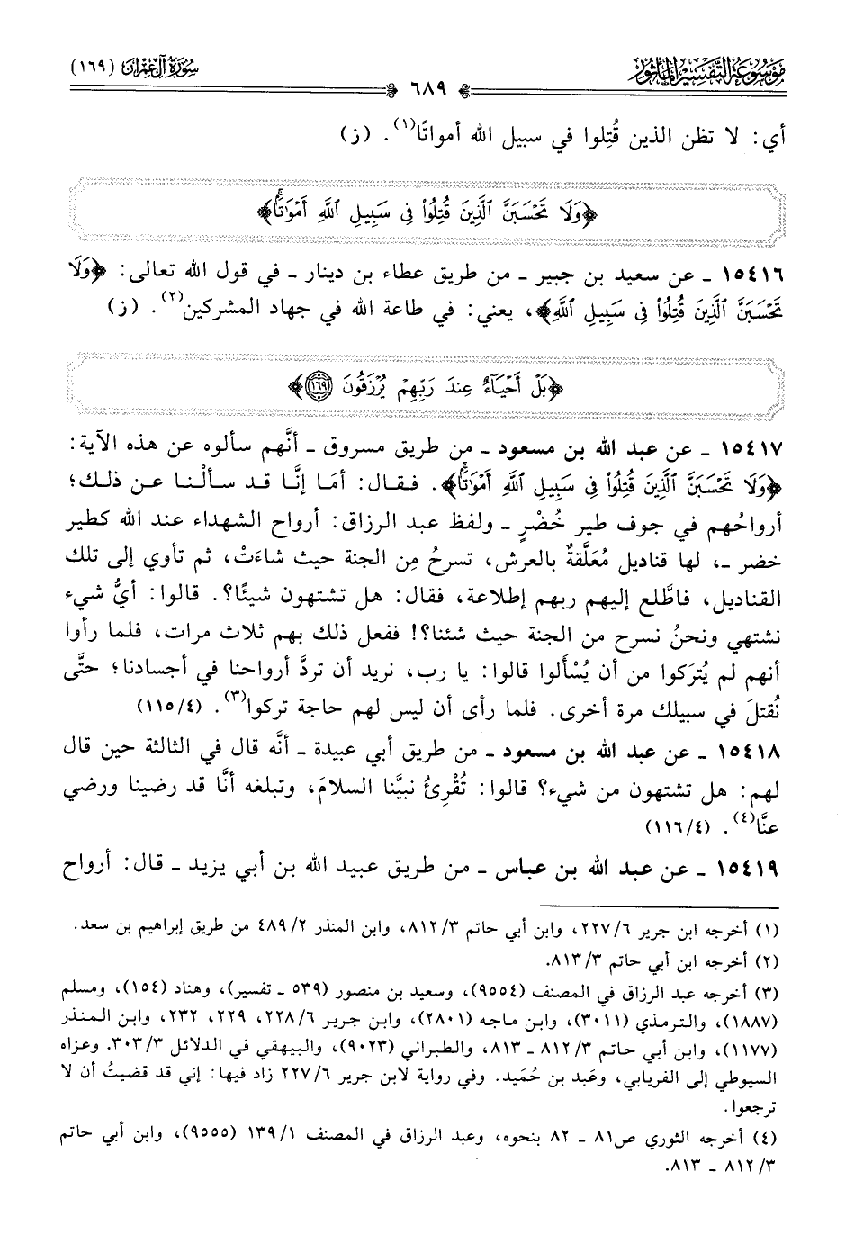 ١٥٤١٧ - عن عبد الله بن مسعود -من طريق مسروق- أنّهم سألوه عن هذه الآية: {ولا تحسبن الذين قتلوا في سبيل الله أمواتا}. فقال: أما إنّا قد سألْنا عن ذلك؛ أرواحُهم في جوف طير خُضْرٍ -ولفظ عبد الرزاق: أرواح الشهداء عند الله كطير خضر-، لها قناديل مُعَلَّقةٌ بالعرش، تسرحُ مِن الجنة حيث شاءَتْ، ثم تأوي إلى تلك القناديل، فاطَّلع إليهم ربهم إطلاعة، فقال: هل تشتهون شيئًا؟. قالوا: أيُّ شيء نشتهي ونحنُ نسرح من الجنة حيث شئنا؟! ففعل ذلك بهم ثلاث مرات، فلما رأوا أنهم لم يُترَكوا من أن يُسْأَلوا قالوا: يا رب، نريد أن تردَّ أرواحنا في أجسادنا؛ حتّى نُقتلَ في سبيلك مرة أخرى. فلما رأى أن ليس لهم حاجة تركوا (¬٣). (٤/ ١١٥)