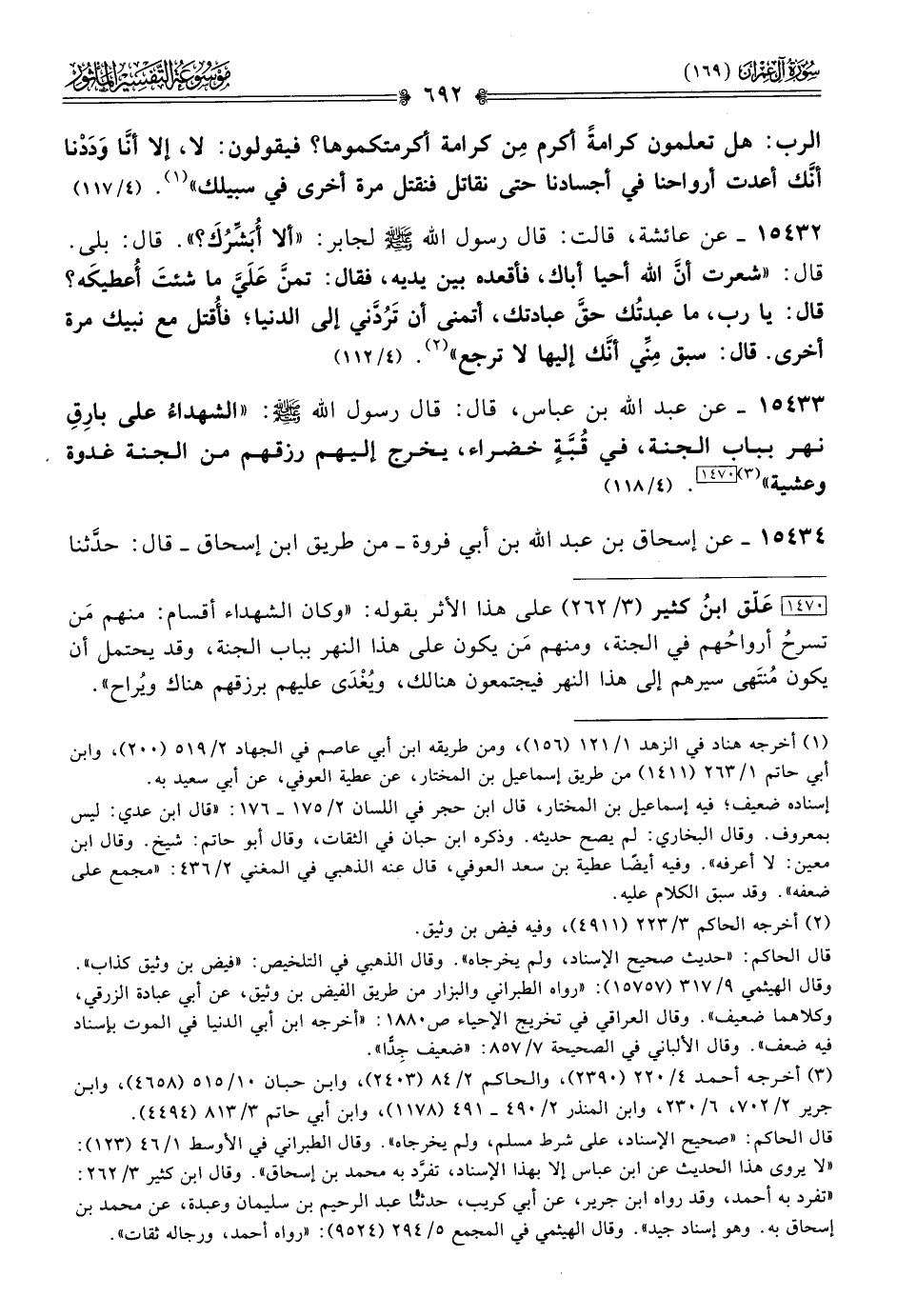 [١٤٧٠] عَلّق ابنُ كثير (٣/ ٢٦٢) على هذا الأثر بقوله: «وكان الشهداء أقسام: منهم مَن تسرحُ أرواحُهم في الجنة، ومنهم مَن يكون على هذا النهر بباب الجنة، وقد يحتمل أن يكون مُنتَهى سيرهم إلى هذا النهر فيجتمعون هنالك، ويُغْدى عليهم برزقهم هناك ويُراح».