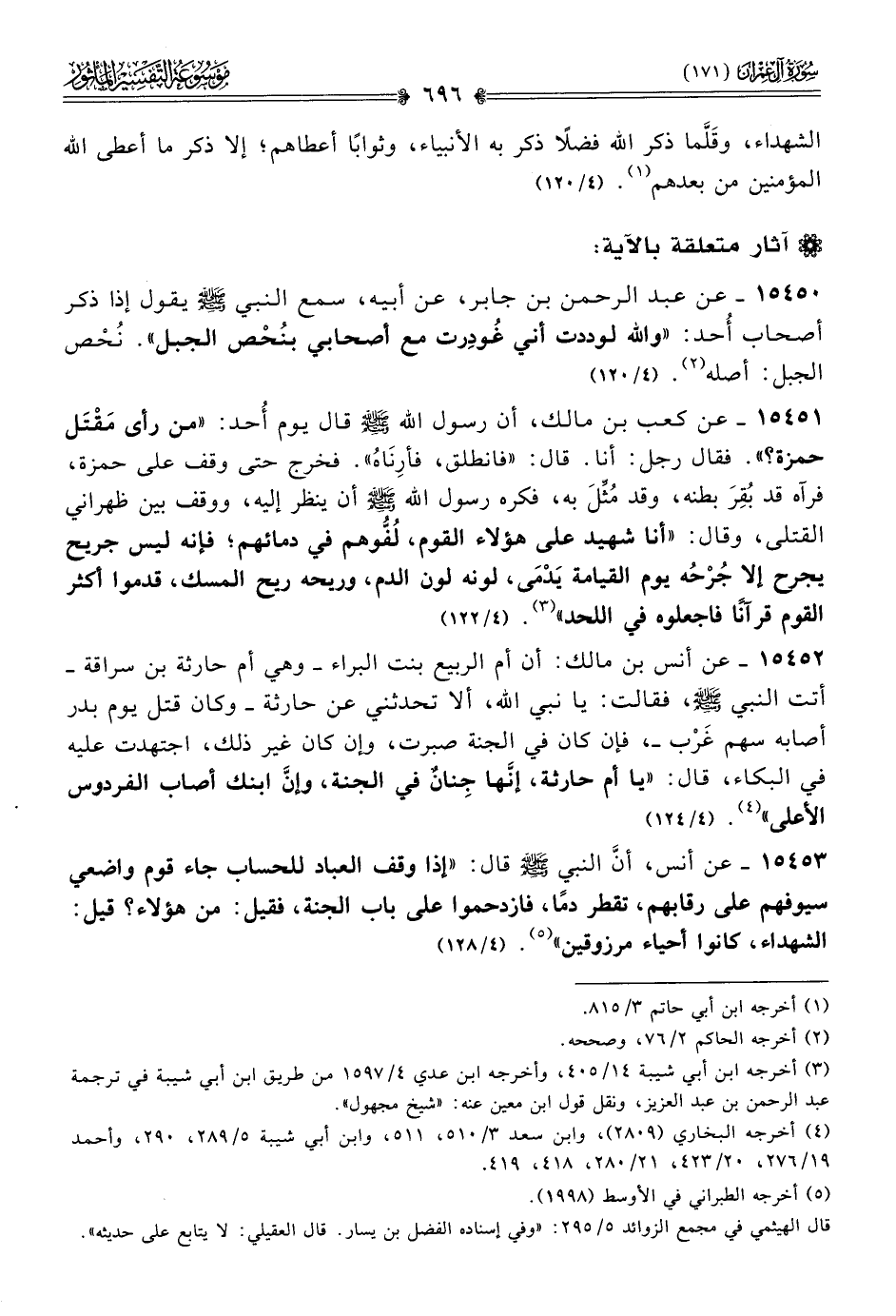 ١٥٤٥١ - عن كعب بن مالك، أن رسول الله - صلى الله عليه وسلم - قال يوم أحد: «من رأى مَقْتَل حمزة؟». فقال رجل: أنا. قال: «فانطلق، فأرِناهُ». فخرج حتى وقف على حمزة، فرآه قد بُقِرَ بطنه، وقد مُثِّلَ به، فكره رسول الله - صلى الله عليه وسلم - أن ينظر إليه، ووقف بين ظهراني القتلى، وقال: «أنا شهيد على هؤلاء القوم، لُفُّوهم في دمائهم؛ فإنه ليس جريح يجرح إلا جُرْحُه يوم القيامة يَدْمى، لونه لون الدم، وريحه ريح المسك، قدموا أكثر القوم قرآنًا فاجعلوه في اللحد» (¬٣). (٤/ ١٢٢)