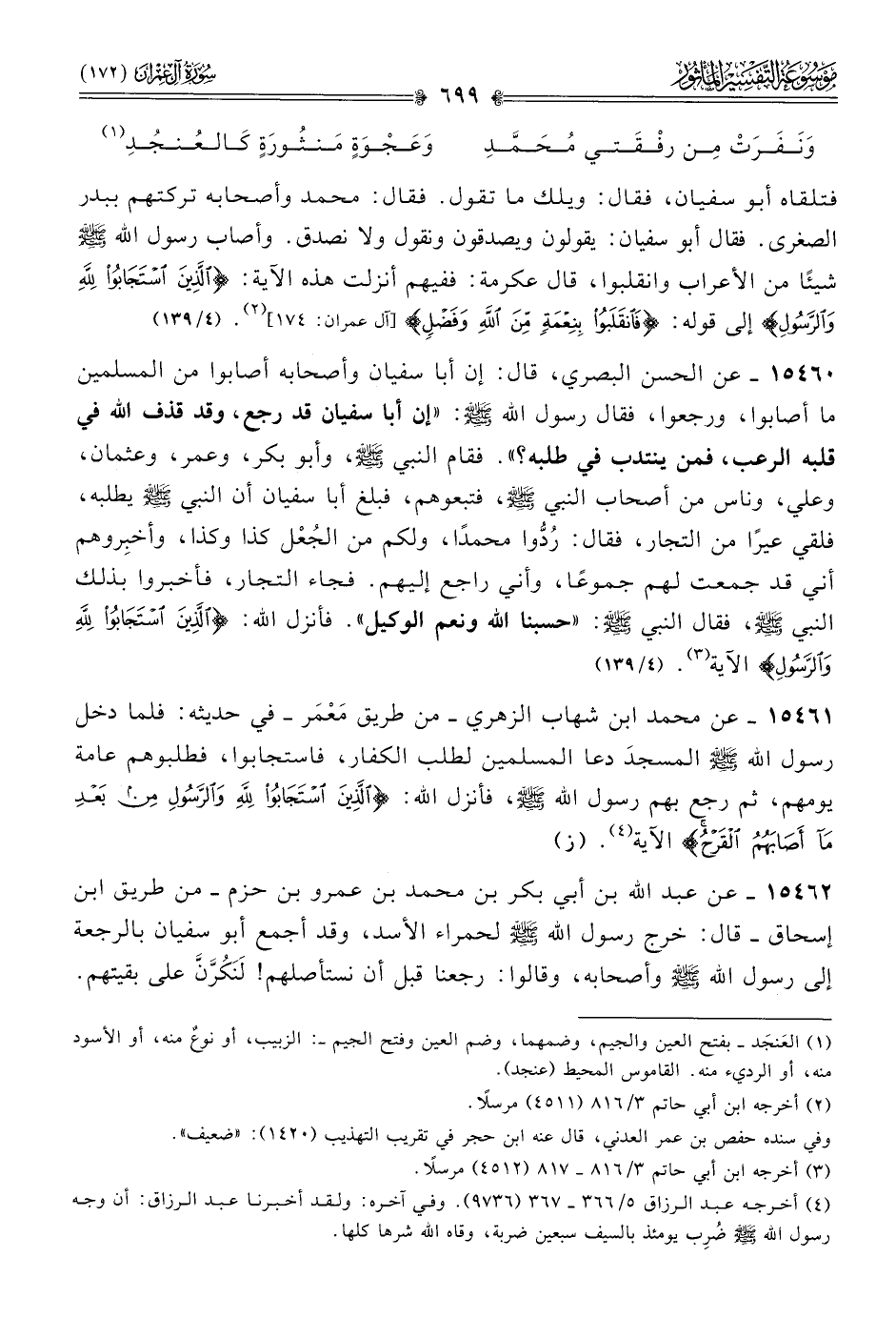 ١٥٤٦٠ - عن الحسن البصري، قال: إن أبا سفيان وأصحابه أصابوا من المسلمين ما أصابوا، ورجعوا، فقال رسول الله - صلى الله عليه وسلم -: «إن أبا سفيان قد رجع، وقد قذف الله في قلبه الرعب، فمن ينتدب في طلبه؟». فقام النبي - صلى الله عليه وسلم -، وأبو بكر، وعمر، وعثمان، وعلي، وناس من أصحاب النبي - صلى الله عليه وسلم -، فتبعوهم، فبلغ أبا سفيان أن النبي - صلى الله عليه وسلم - يطلبه، فلقي عيرًا من التجار، فقال: رُدُّوا محمدًا، ولكم من الجُعْل كذا وكذا، وأخبِروهم أني قد جمعت لهم جموعًا، وأني راجع إليهم. فجاء التجار، فأخبروا بذلك النبي - صلى الله عليه وسلم -، فقال النبي - صلى الله عليه وسلم -: «حسبنا الله ونعم الوكيل». فأنزل الله: {الذين استجابوا لله والرسول} الآية (¬٣). (٤/ ١٣٩)