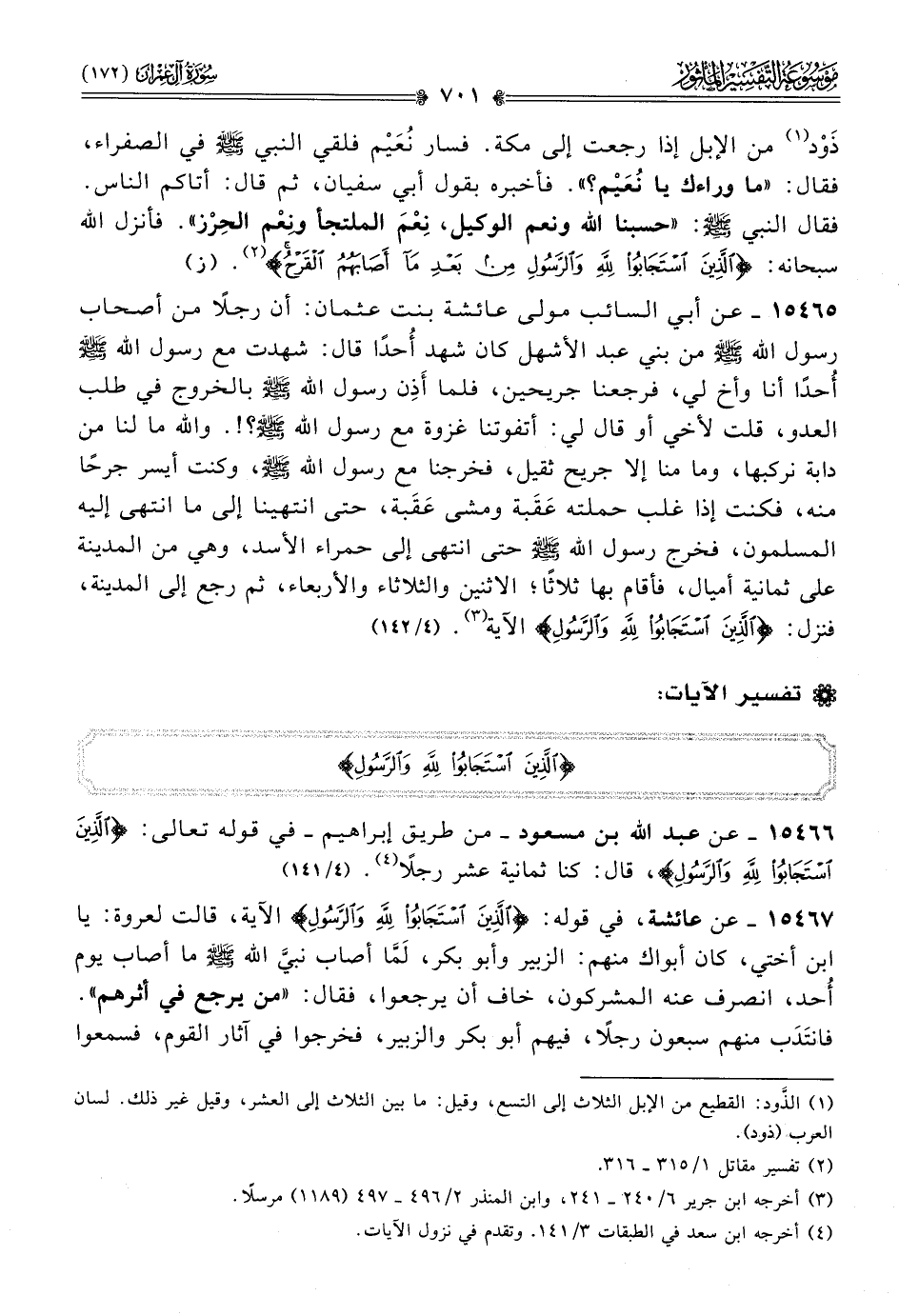 ١٥٤٦٧ - عن عائشة، في قوله: {الذين استجابوا لله والرسول} الآية، قالت لعروة: يا ابن أختي، كان أبواك منهم: الزبير وأبو بكر، لَمّا أصاب نبيَّ الله - صلى الله عليه وسلم - ما أصاب يوم أحد، انصرف عنه المشركون، خاف أن يرجعوا، فقال: «من يرجع في أثرهم». فانتَدَب منهم سبعون رجلًا، فيهم أبو بكر والزبير، فخرجوا في آثار القوم، فسمعوا