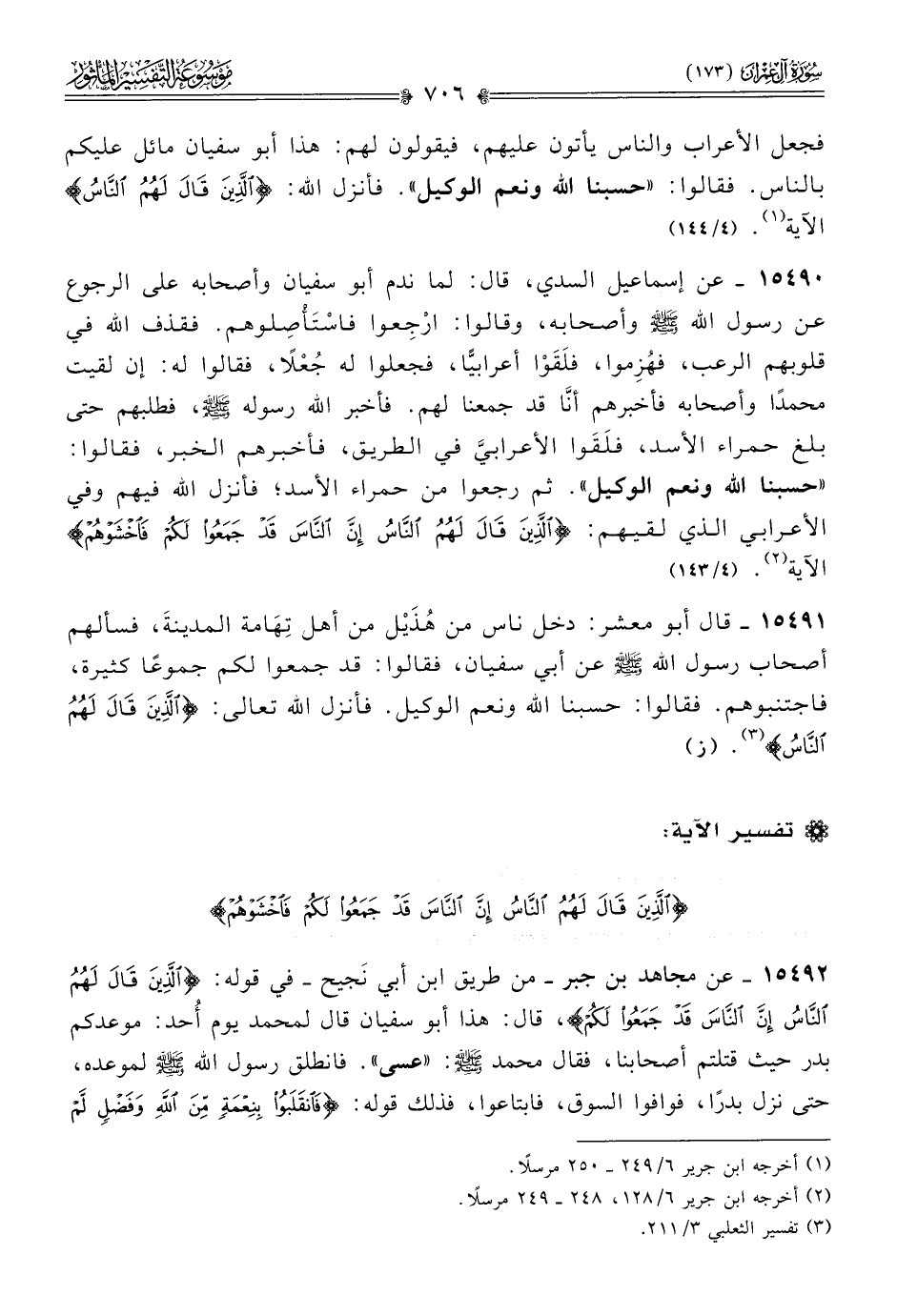 ١٥٤٩٢ - عن مجاهد بن جبر -من طريق ابن أبي نَجيح- في قوله: {الذين قال لهم الناس إن الناس قد جمعوا لكم}، قال: هذا أبو سفيان قال لمحمد يوم أحد: موعدكم بدر حيث قتلتم أصحابنا، فقال محمد - صلى الله عليه وسلم -: «عسى». فانطلق رسول الله - صلى الله عليه وسلم - لموعده، حتى نزل بدرًا، فوافوا السوق، فابتاعوا، فذلك قوله: {فانقلبوا بنعمة من الله وفضل لم