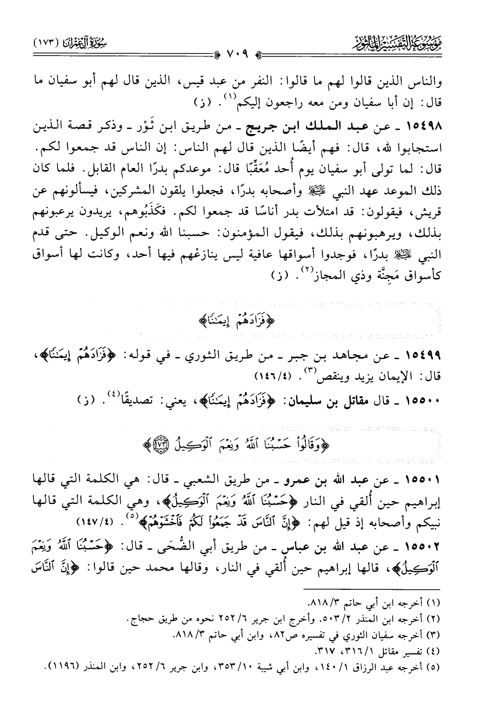 ١٥٥٠٢ - عن عبد الله بن عباس -من طريق أبي الضُّحى- قال: {حسبنا الله ونعم الوكيل}، قالها إبراهيم حين أُلقي في النار، وقالها محمد حين قالوا: {إن الناس