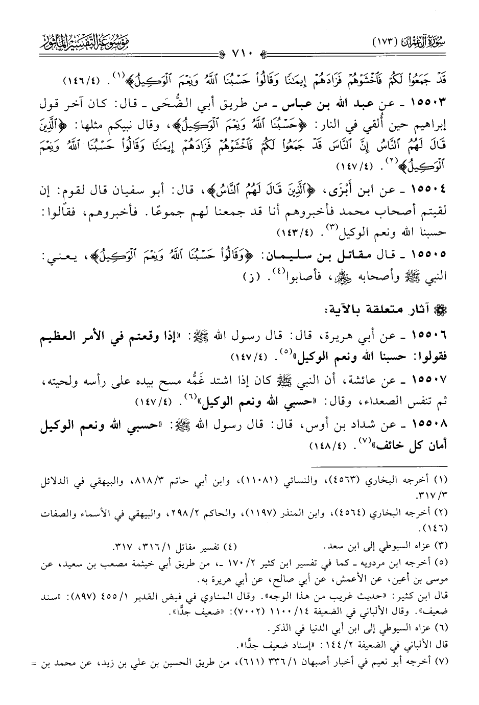 قد جمعوا لكم فاخشوهم فزادهم إيمانا وقالوا حسبنا الله ونعم الوكيل} (¬١). (٤/ ١٤٦)