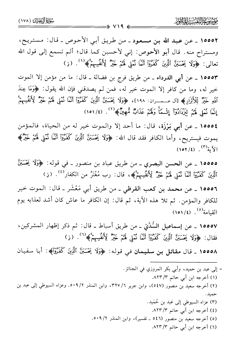 ١٥٥٥٤ - عن أبي بَرْزَة، قال: ما أحد إلا والموت خير له من الحياة، فالمؤمن يموت فيستريح، وأما الكافر فقد قال الله: {ولا يحسبن الذين كفروا أنما نملي لهم خير} الآية (¬٣). (٤/ ١٥٢)