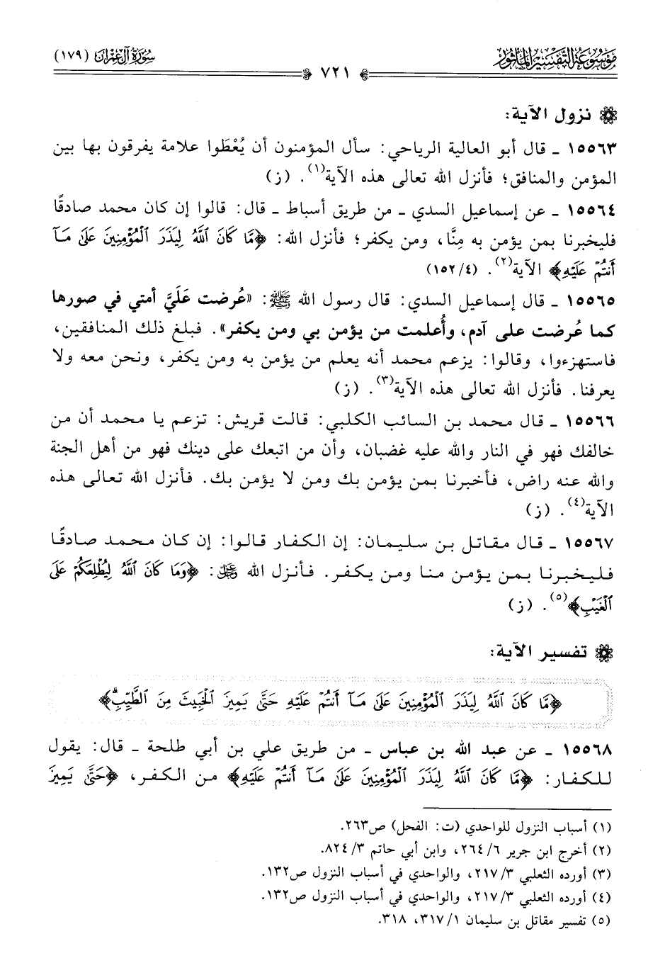 ١٥٥٦٨ - عن عبد الله بن عباس -من طريق علي بن أبي طلحة- قال: يقول للكفار: {ما كان الله ليذر المؤمنين على ما أنتم عليه} من الكفر، {حتى يميز