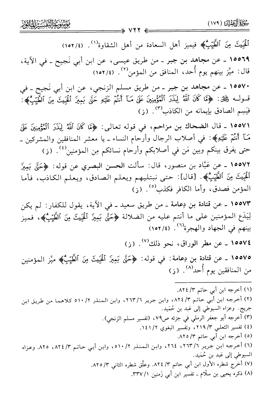 ١٥٥٧٣ - عن قتادة بن دِعامة -من طريق سعيد- في الآية، يقول للكفار: لم يكن لِيَدَع المؤمنين على ما أنتم عليه من الضلالة {حتى يميز الخبيث من الطيب}، فميز بينهم في الجهاد والهجرة (¬٦). (٤/ ١٥٢)