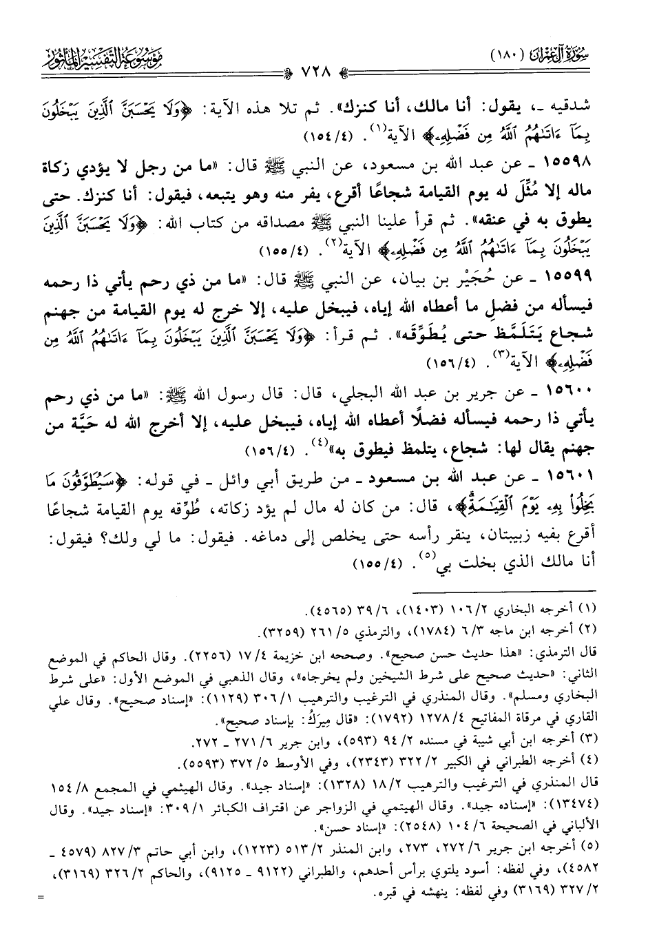 ١٥٥٩٨ - عن عبد الله بن مسعود، عن النبي - صلى الله عليه وسلم - قال: «ما من رجل لا يؤدي زكاة ماله إلا مُثِّلَ له يوم القيامة شجاعًا أقرع، يفر منه وهو يتبعه، فيقول: أنا كنزك. حتى يطوق به في عنقه». ثم قرأ علينا النبي - صلى الله عليه وسلم - مصداقه من كتاب الله: {ولا يحسبن الذين يبخلون بما آتاهم الله من فضله} الآية (¬٢). (٤/ ١٥٥)