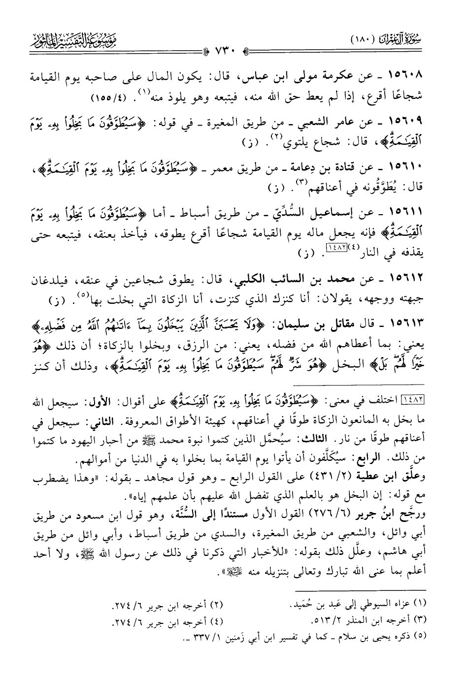 ١٥٦٠٩ - عن عامر الشعبي -من طريق المغيرة- في قوله: {سيطوقون ما بخلوا به يوم القيامة}، قال: شجاع يلتوي (¬٢). (ز)