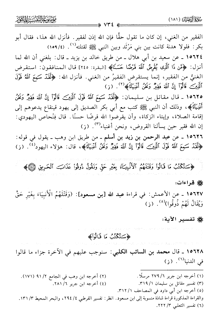 ١٥٦٢٥ - قال مقاتل بن سليمان: {لقد سمع الله قول الذين قالوا إن الله فقير ونحن أغنياء}، وذلك أن النبي - صلى الله عليه وسلم - كتب مع أبي بكر الصديق إلى يهود قينقاع يدعوهم إلى إقامة الصلاة، وإيتاء الزكاة، وأن يقرضوا الله قرضًا حسنًا. قال فِنْحاص اليهودي: إن الله فقير حين يسألنا القروض، ونحن أغنياء (¬٣). (ز)