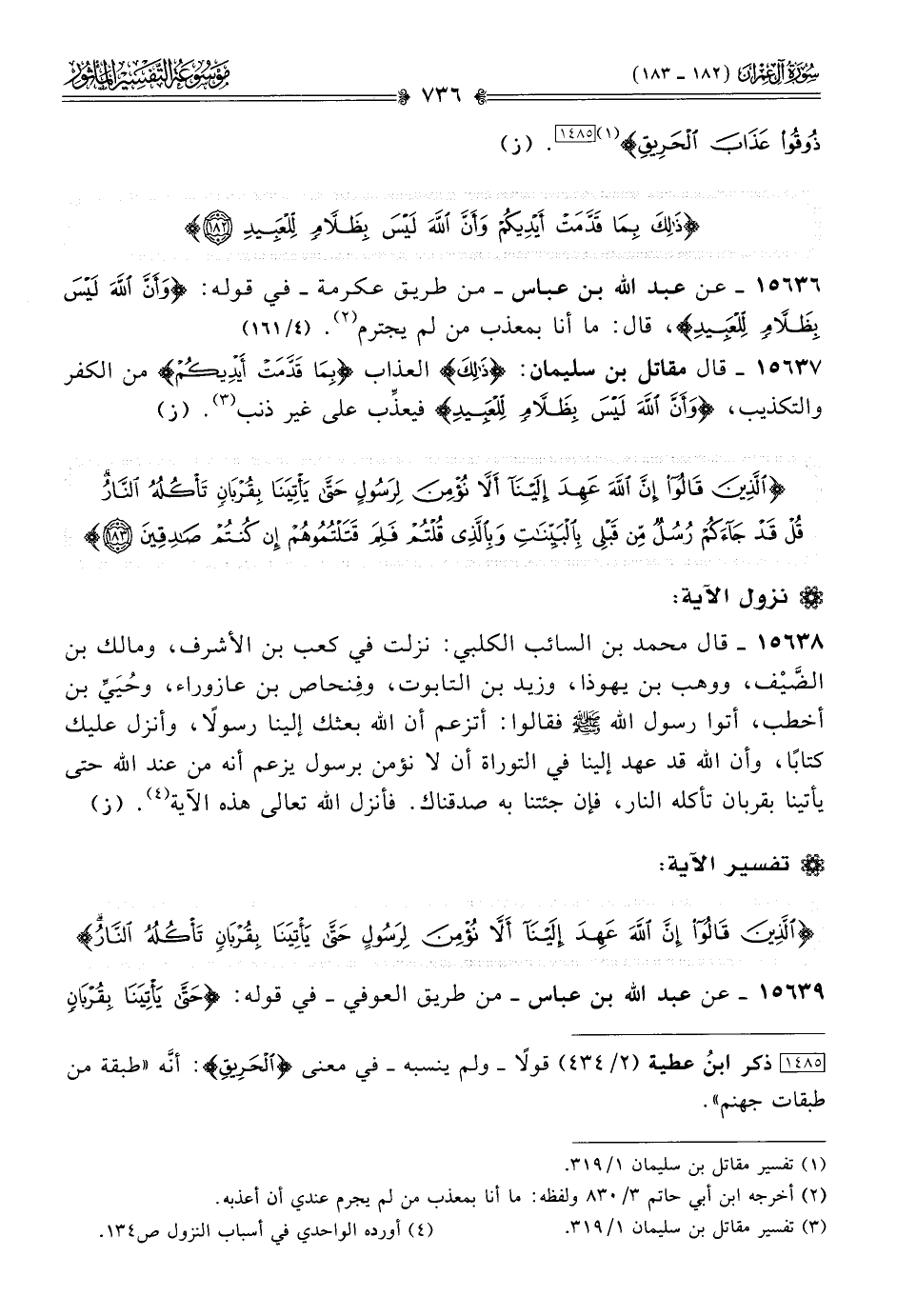 ١٥٦٣٨ - قال محمد بن السائب الكلبي: نزلت في كعب بن الأشرف، ومالك بن الضَّيْف، ووهب بن يهوذا، وزيد بن التابوت، وفِنحاص بن عازوراء، وحُيَيِّ بن أخطب، أتوا رسول الله - صلى الله عليه وسلم - فقالوا: أتزعم أن الله بعثك إلينا رسولًا، وأنزل عليك كتابًا، وأن الله قد عهد إلينا في التوراة أن لا نؤمن برسول يزعم أنه من عند الله حتى يأتينا بقربان تأكله النار، فإن جئتنا به صدقناك. فأنزل الله تعالى هذه الآية (¬٤). (ز)