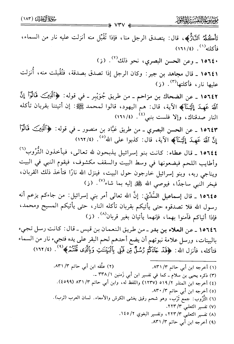 ١٥٦٤٢ - عن الضحاك بن مزاحم -من طريق جُوَيْبِر- في قوله: {الذين قالوا إن الله عهد إلينا} الآية، قال: هم اليهود، قالوا لمحمد - صلى الله عليه وسلم -: إن أتيتنا بقربان تأكله النار صدقناك، وإلا فلست بنبي (¬٤). (٤/ ١٦١)