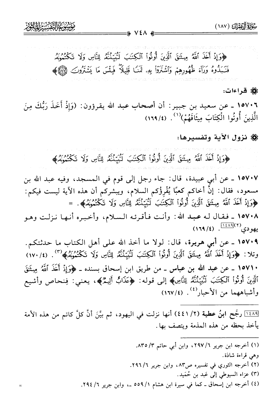 ١٥٧٠٩ - عن أبي هريرة، قال: لولا ما أخذ الله على أهل الكتاب ما حدثتكم. وتلا: {وإذ أخذ الله ميثاق الذين أوتوا الكتاب لتبيننه للناس ولا تكتمونه} (¬٣). (٤/ ١٧٠)