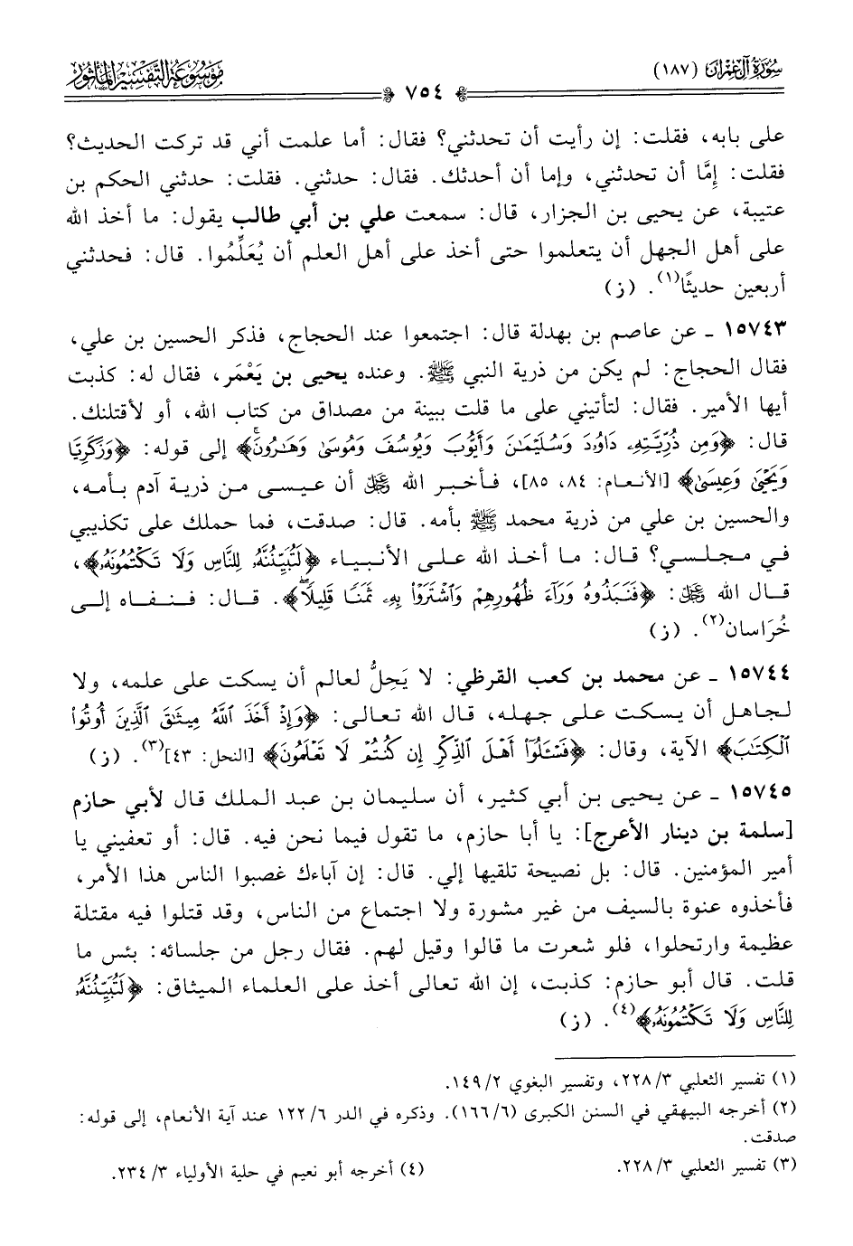 ١٥٧٤٤ - عن محمد بن كعب القرظي: لا يَحِلُّ لعالم أن يسكت على علمه، ولا لجاهل أن يسكت على جهله، قال الله تعالى: {وإذ أخذ الله ميثاق الذين أوتوا الكتاب} الآية، وقال: {فاسألوا أهل الذكر إن كنتم لا تعلمون} [النحل: ٤٣] (¬٣). (ز)