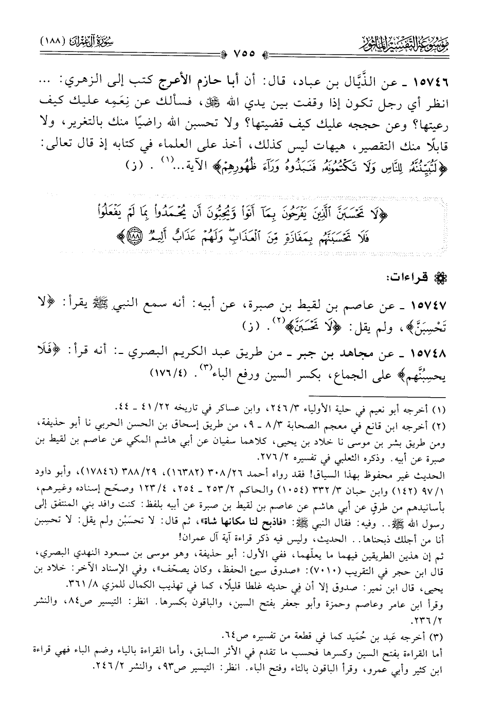 ١٥٧٤٧ - عن عاصم بن لقيط بن صبرة، عن أبيه: أنه سمع النبي - صلى الله عليه وسلم - يقرأ: «لا تَحْسِبَنَّ»، ولم يقل: {لا تَحْسَبَنَّ} (¬٢). (ز)