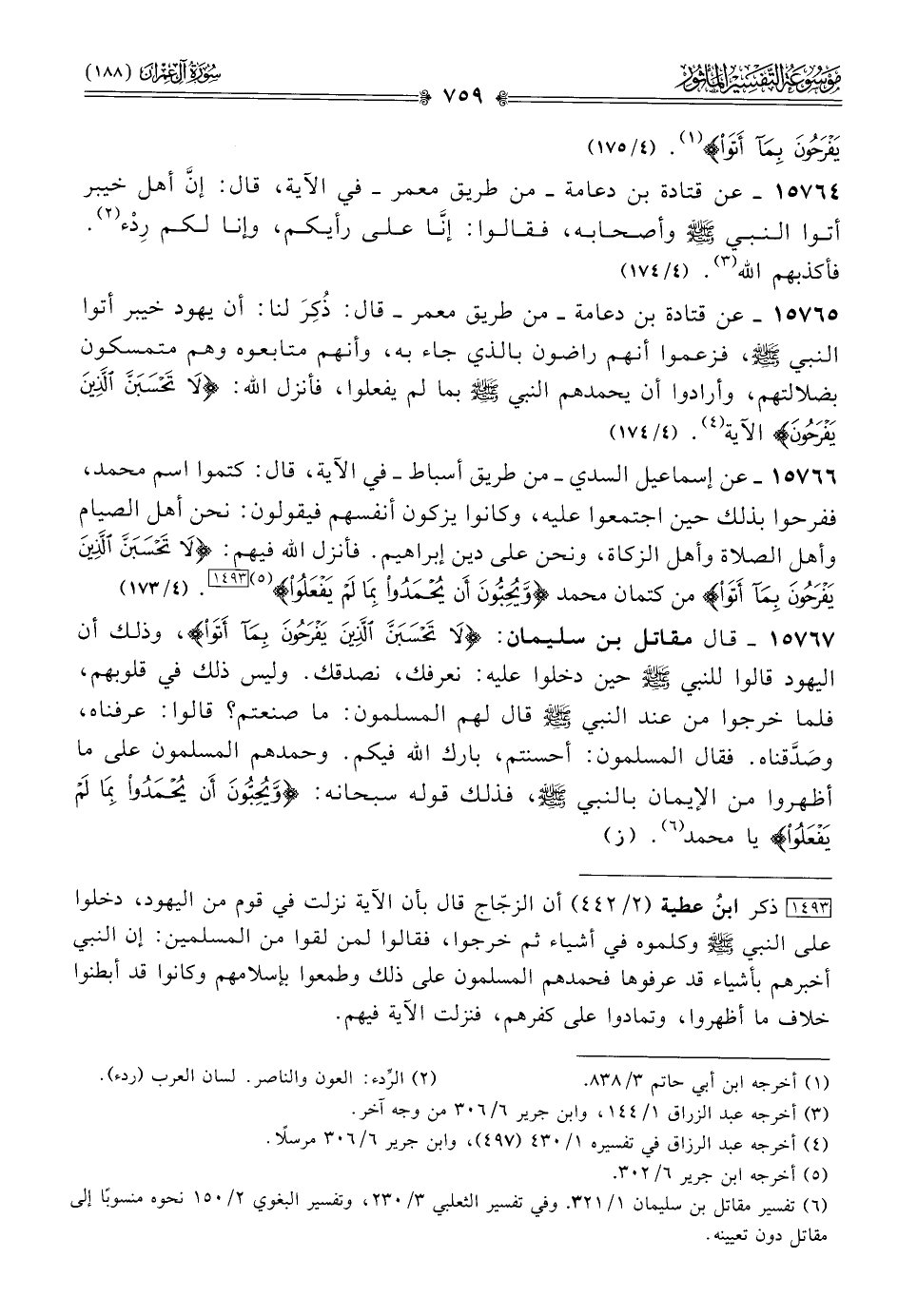 ١٥٧٦٥ - عن قتادة بن دعامة -من طريق معمر- قال: ذُكِرَ لنا: أن يهود خيبر أتوا النبي - صلى الله عليه وسلم -، فزعموا أنهم راضون بالذي جاء به، وأنهم متابعوه وهم متمسكون بضلالتهم، وأرادوا أن يحمدهم النبي - صلى الله عليه وسلم - بما لم يفعلوا، فأنزل الله: {لا تحسبن الذين يفرحون} الآية (¬٤). (٤/ ١٧٤)