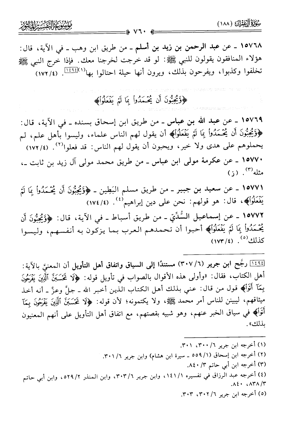 ١٥٧٦٩ - عن عبد الله بن عباس -من طريق ابن إسحاق بسنده- في الآية، قال: {ويحبون أن يحمدوا بما لم يفعلوا} أن يقول لهم الناس علماء، وليسوا بأهل علم، لم يحملوهم على هدى ولا خير، ويحبون أن يقول لهم الناس: قد فعلوا (¬٢). (٤/ ١٧٤)